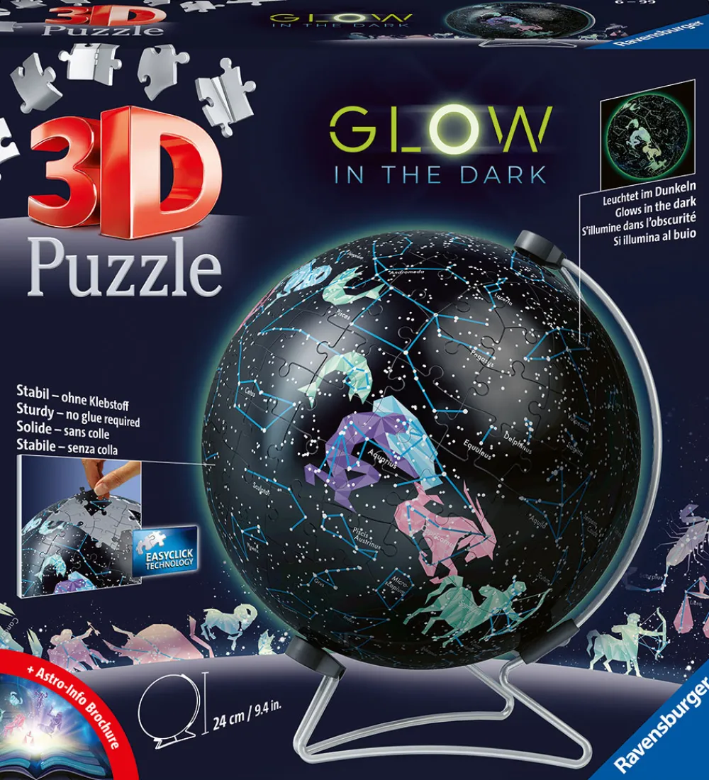 Puslespillet består af 180 brikker har en smart 3D-effekt og samles som en globus og sættes på den modfølgende stander. Puslespillet kan drejes rundt som en globus på standeren. Puslespillet lyser op i mørke, og tilføjer et hyggeligt element til børneværelset. Ravensburger sikrer en høj kvalitet, der gør samlingen let og sjov.