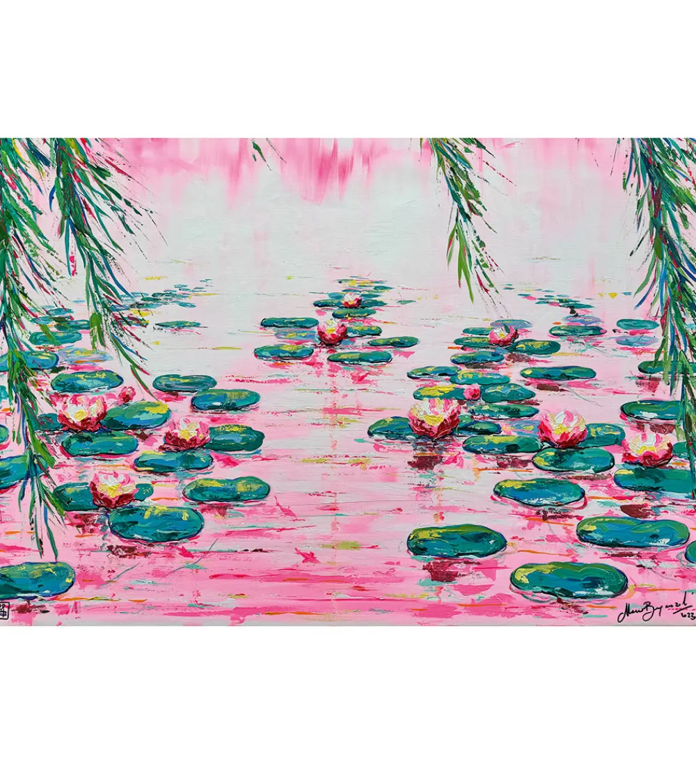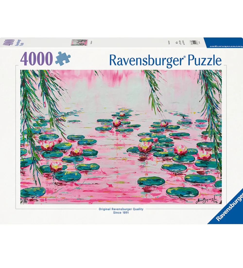 Flot Ravensburger puslespil med et flot motiv af en sø med åkander og hængende grene i primært rosa og grønne nuancer.