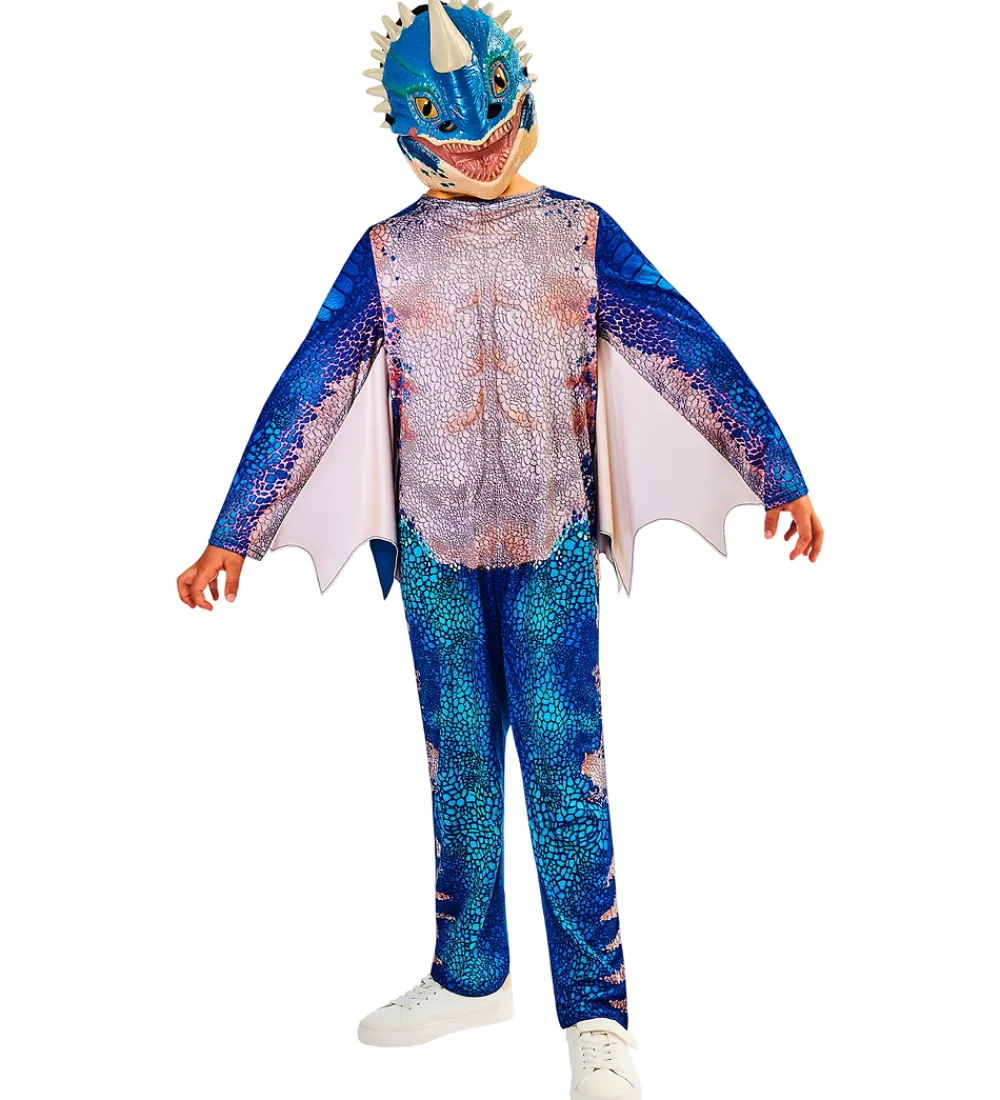 Sejt Rubies udklædning med et kostume og en maske, så barnet kan klæde sig ud som Nadder fra How to train your Dragon.