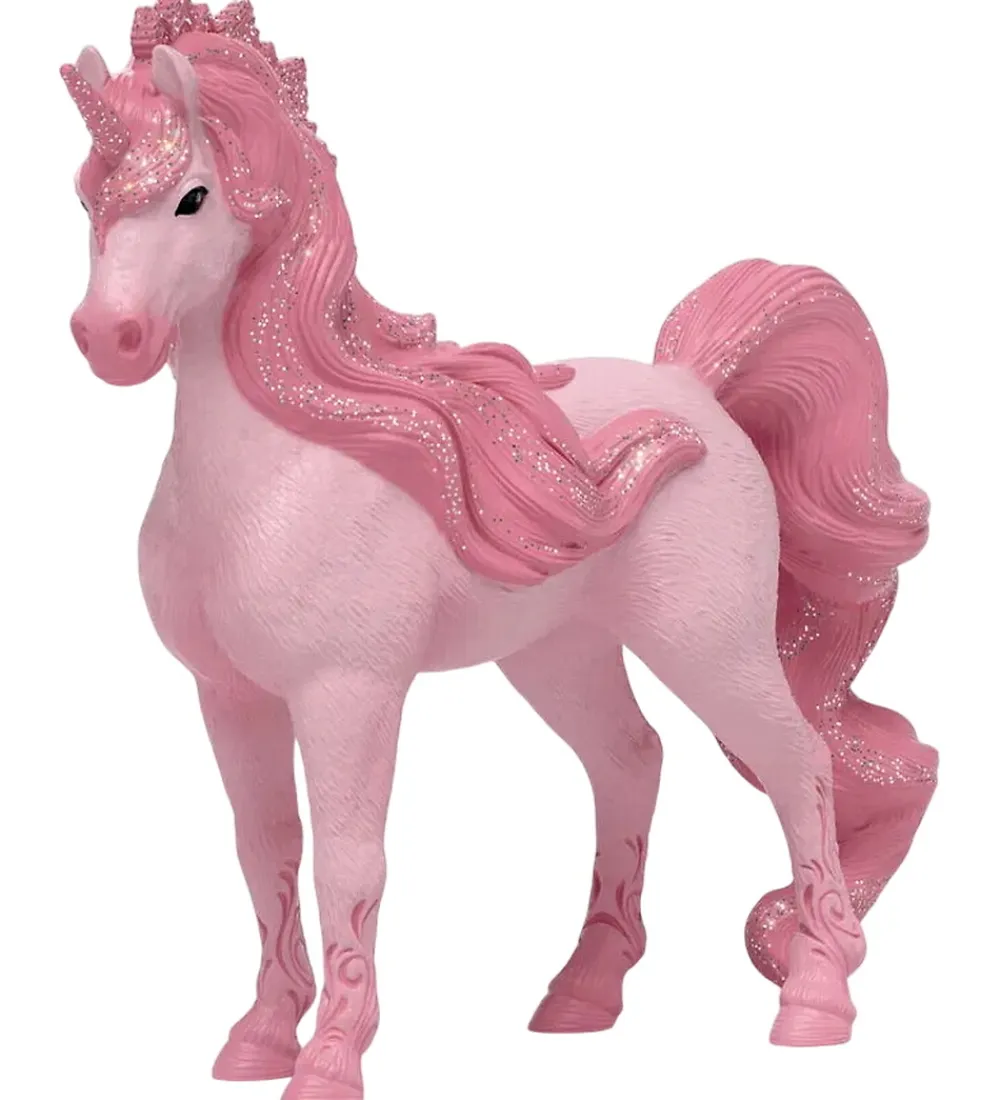Flot Schleich Bayala enhjørning med navnet Cassiopeia, der er rosa og med glimmer ig stjerne-print. Cassiopeia er et samlerobjekt.