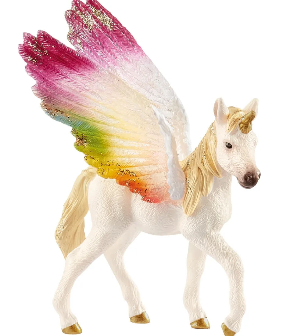 Yndig Schleich Bayala regnbue enhjørning føl i hvid med regnbuefarvede vinger med guldglimmer, samt guldglimmer i manken og på halen.