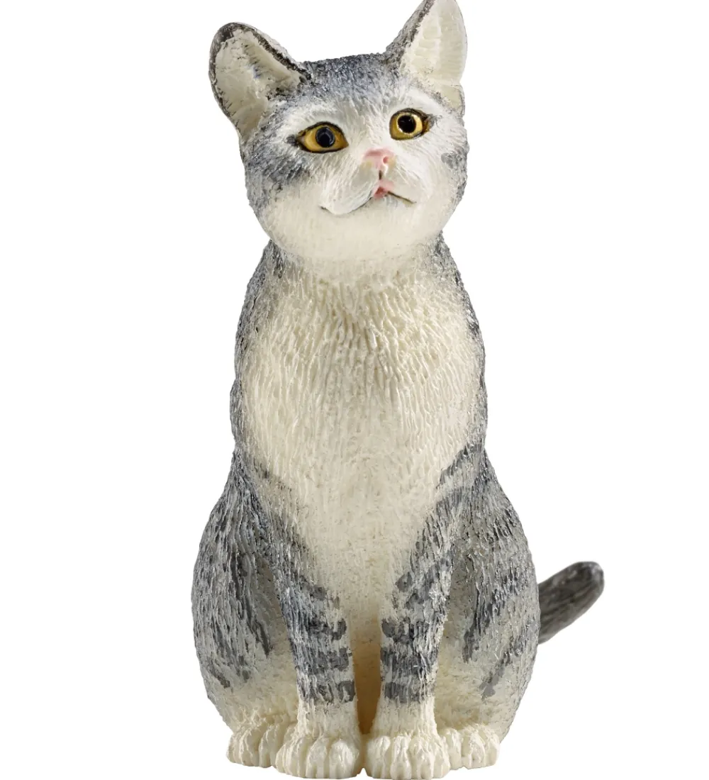 Sød Schleich kat i grå og hvide nuancer, med gule øjne.