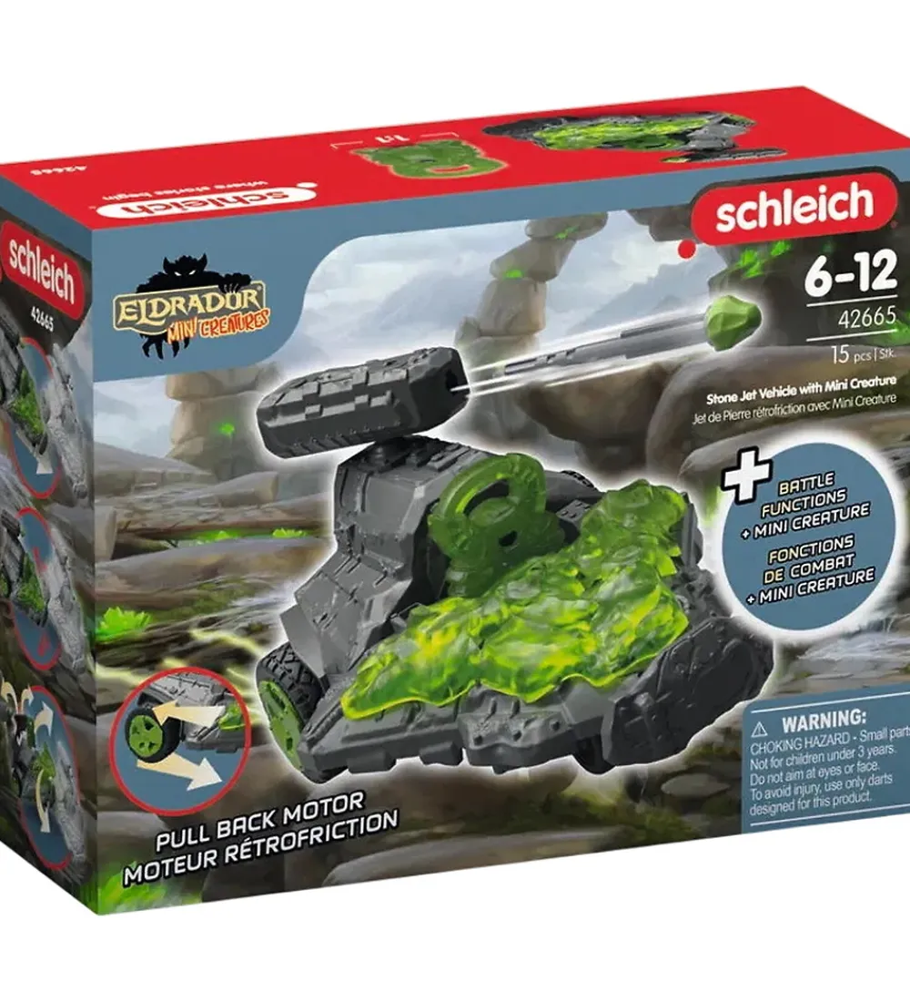 Schleich Eldrador Mini Creatures legetøjet gør ethvert børneværelse til en actionzone. Stone jet køretøjet kan køre selv når den bliver trukket tilbage, derudover har den et roterende skydevåben der kan skyde med pile.