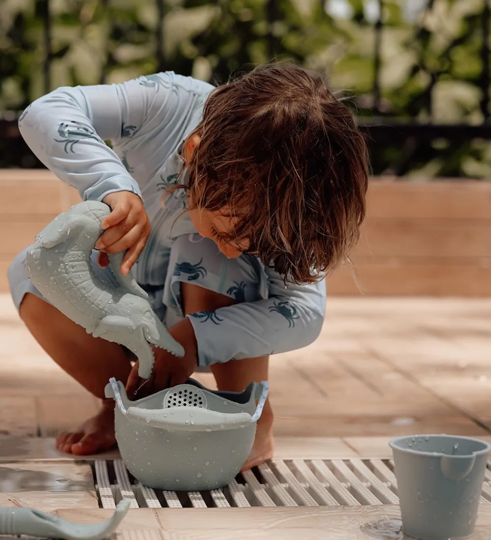 Skøn Scrunch vandkane i støvet lyseblå med form som en krokodille.