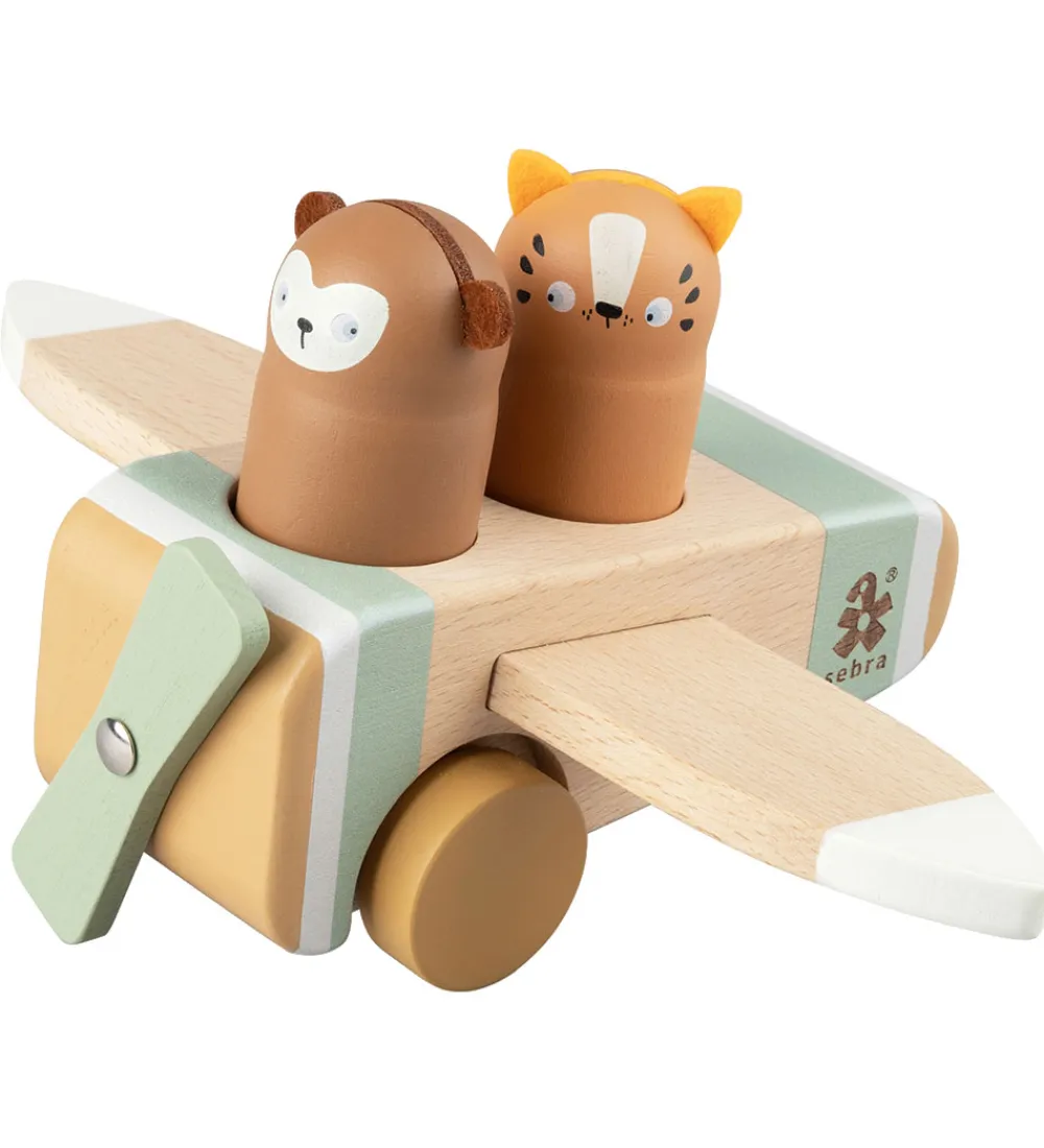 Skøn Sebra flyvemaskine af lyst træ med lakerede detaljer i hvid og mintgrøn, og der medfølger to dyr med bløde ører af filt.