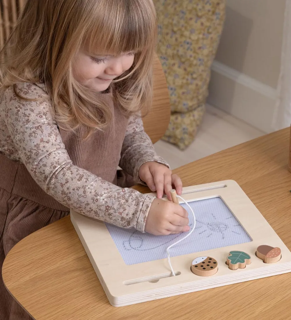 Sebra tegnetavlen kan bruges igen og igen. Med den medfølgende pen, kan man tegne lige, hvad man vil, og ved at skubbe en skyder i bunden hen over pladen, viskes tegningen ud, og man kan begynde på en ny. Der medfølger 3 stempler af træ med form et agern, et blad og en mariehøne.