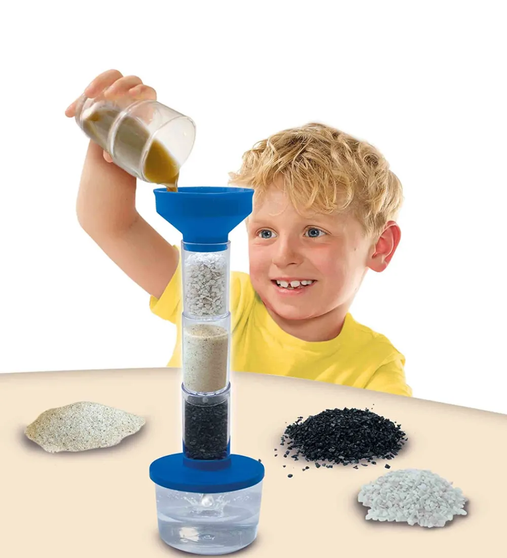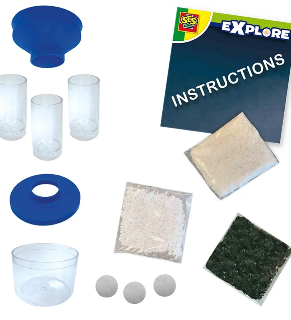 Fedt SES Creative vandrenser sæt lærer børn videnskab på en sjov måde. Man bygger vandfilteret, tager beskidt vand og lader det strømme gennem de 6 lag. Trin for trin bliver vandet filtreret og til sidst vil vandet være helt klart.