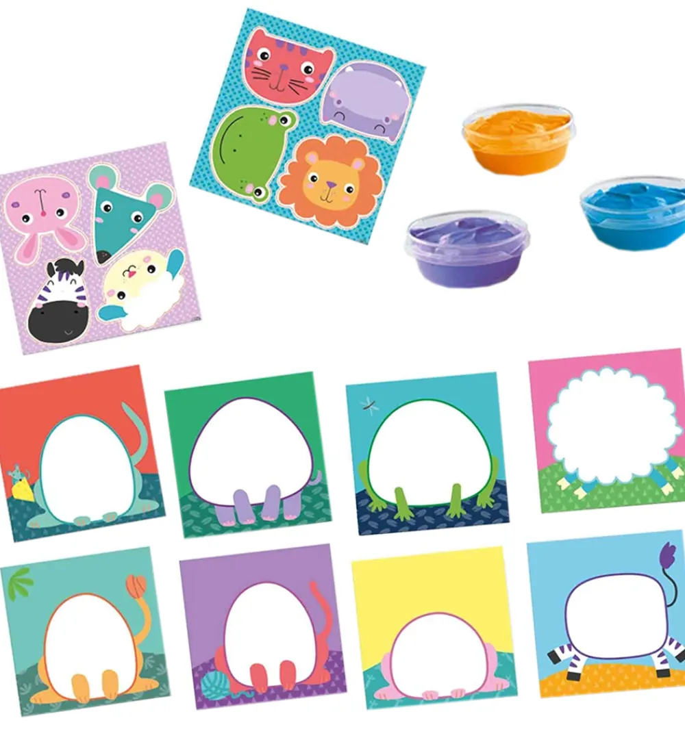 Sjovt SES Creative fingermaling bestående af tre bøtter med fingermaling i lilla, orange og blå samt 8 kort, med forskellige dyr.