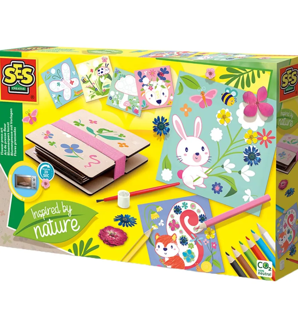 SES Creative kreasættet er perfekt til de kreative små, som vil skabe deres egen leg. Med sættet kan man tørre og presse blomster i den smarte presser, som også kan bruges i microovnen. Blomsterne tørre før man ved det, og efter kan man bruge de fine farveark til at lave flotte kunstværker med rigtige blomster.