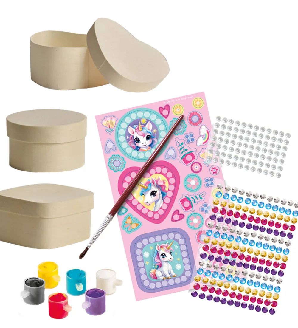 Sættet indeholder materialer til at udsmykke smukke trækasser med enhjørninger, diamanter og perler. Perfekt til kreative børn, der elsker at fremstille.