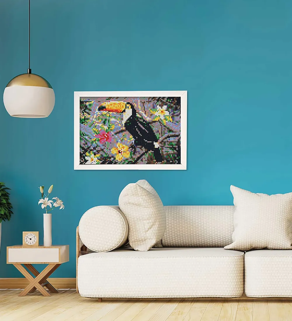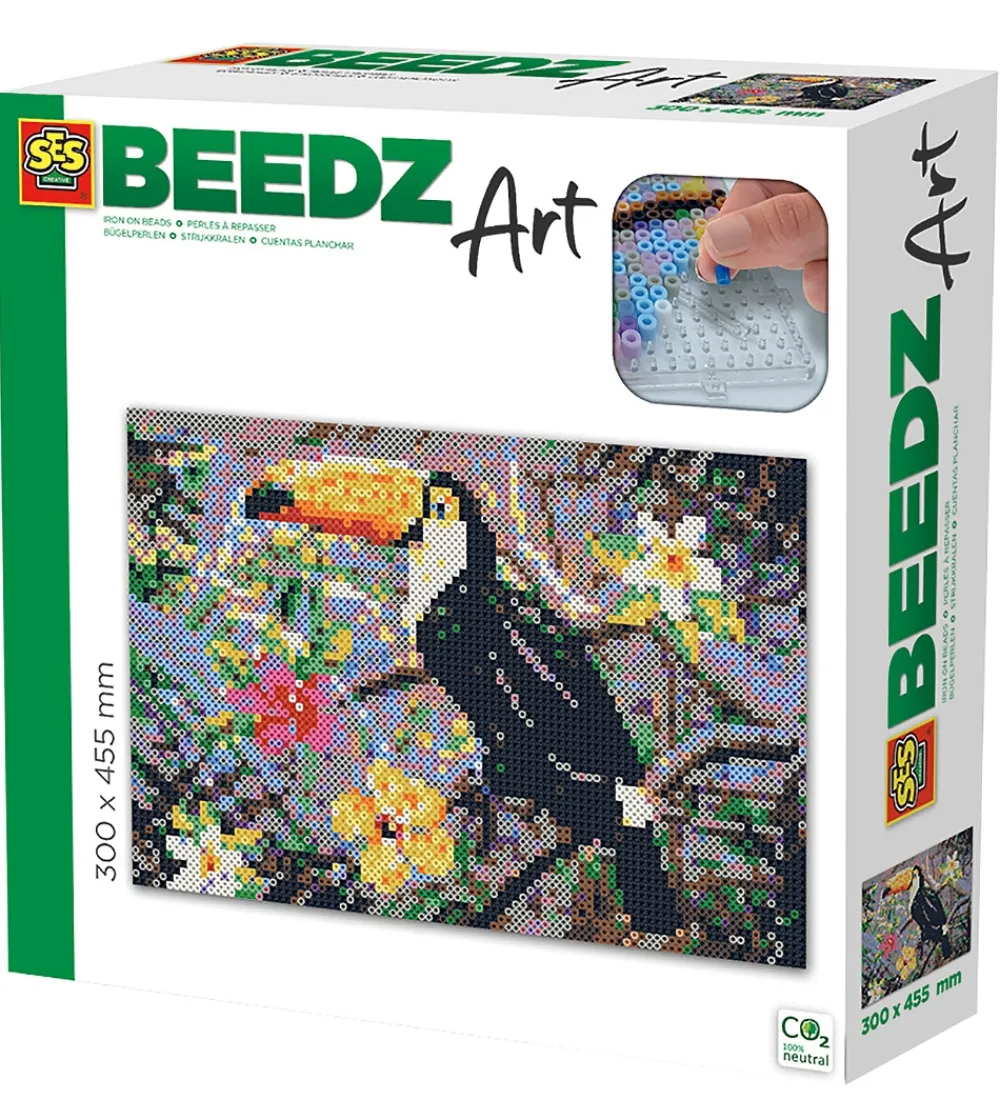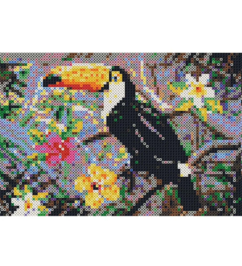 Flot SES Creative strygeperlesæt bestående af 7.000 perler og seks firkantede perleplader, der tilsammen kan laves til et smukt kunstværk med motiv af en tukan. Der medfølger selvfølgelig en trin-for-trin instruktionsmanual.