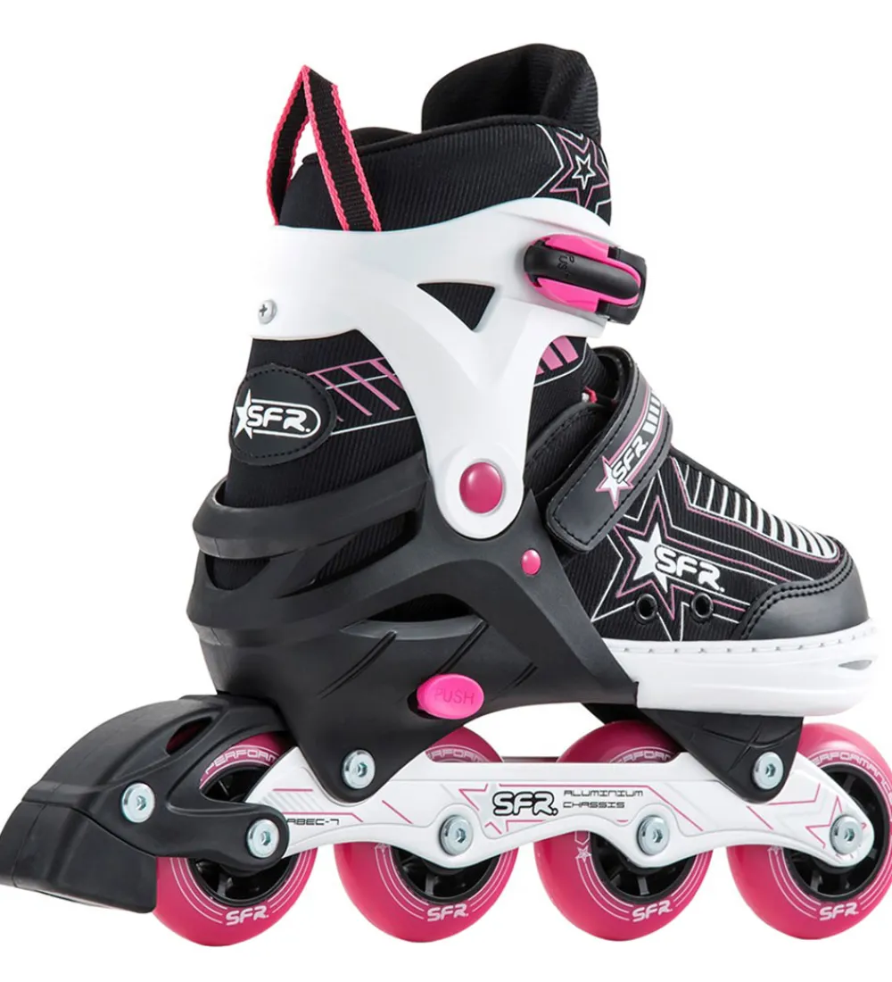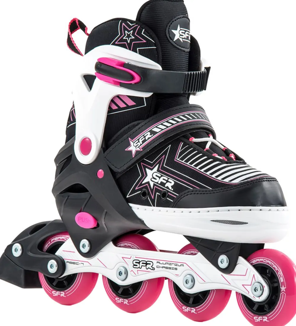 SFR rulleskøjterne er en inliners-model. Rulleskøjterne lukkes foran med en velcrorem og et justerbart plastikspænde. Derudover kan de strammes med snøre over vristen, så de tilpasses til barnets fødder. Bagpå er der en strop, så de er lette at få på. Skaftet har blødt mesh på indersiden og er hårdt udenpå, så rulleskøjterne er behagelige og stabile. Indvendigt er der udtagelige indersåler.