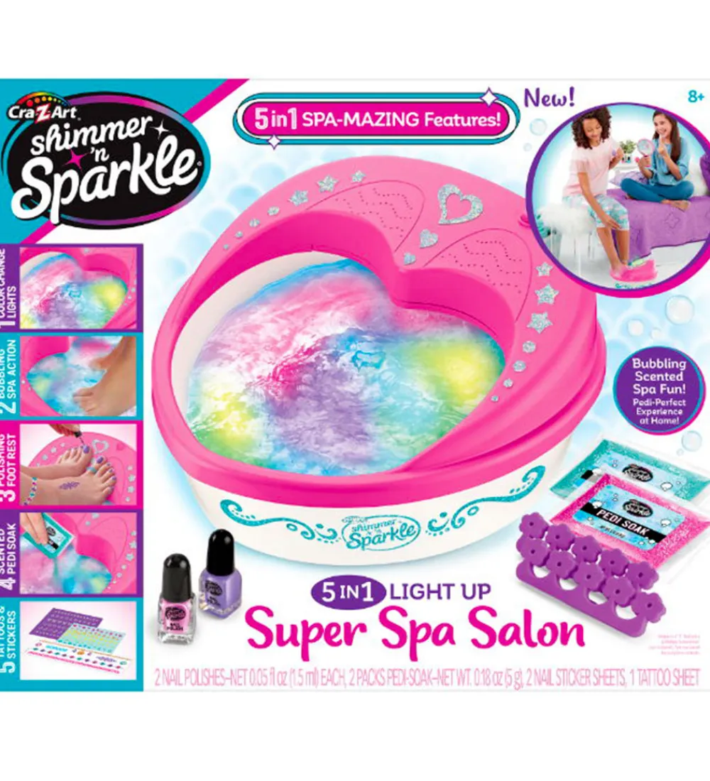 Shimmer N Sparkle spaen er en 5-i-1 model, hvilket vil sige, at den indeholder 5 sjove spa-muligheder; 1 – farveskiftende lys i spa-enheden, 2 – boblebad-funktion, 3 – platform til at hvile føddende på, mens du styler neglene, 4 – “Pedi Soak” med duft, 5 -tatoveringer og klistermærker.