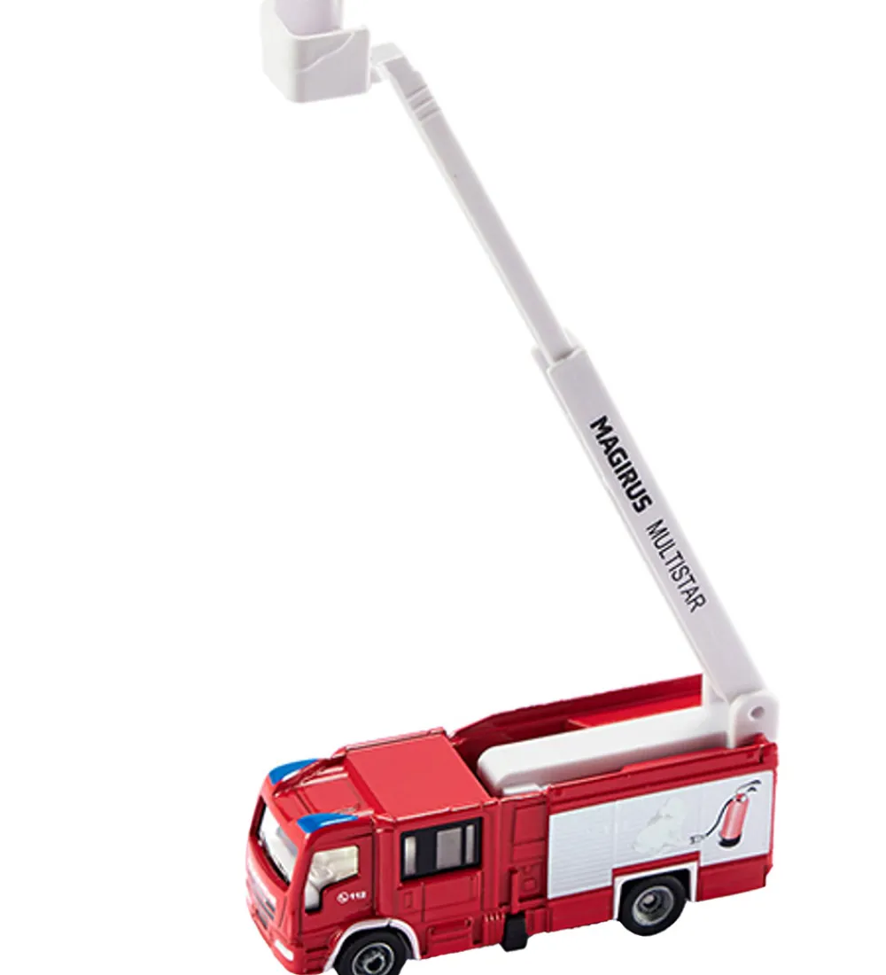 Sjov Siku brandbil i rød og hvid med en udstrækkelig redningskurv.