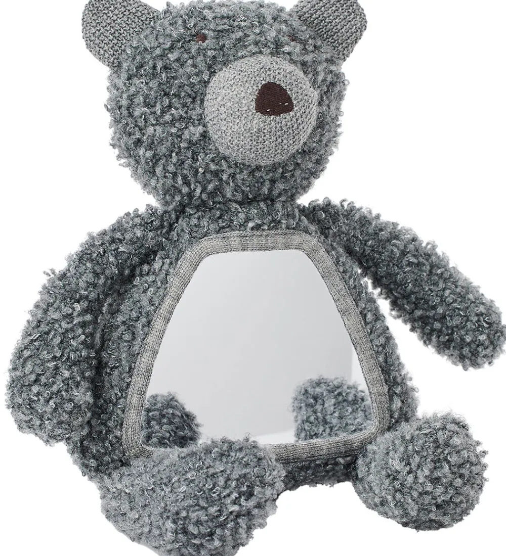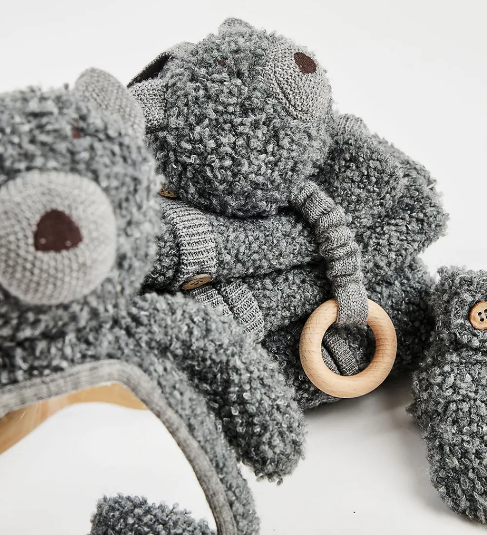 Fin Smallstuff aktivitetsbamse formet som en bjørn i grå nuancer og har en blød, strikket boucléstruktur.