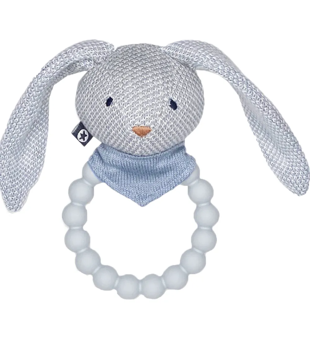 Fin Smallstuff biderangle i blå nuancer, med form som en kanin i toppen, med lange ører og et broderet ansigt.