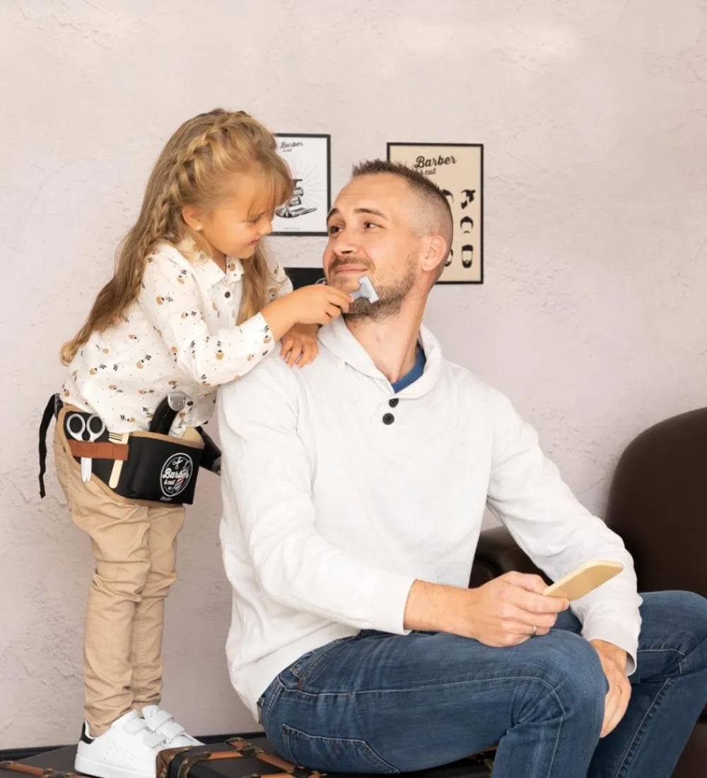 Flot Smoby barbersæt i form af et barberbælte med 10 medfølgende dele, heriblandt en kam, børste, legetøjsføntørre og legetøjs barbermaskine. Barbermaskinen og føntørreren har lys og og lyd, som gør det mere realtistisk. Sættet er underholdende for børn med interesse for at style og lege med hår.