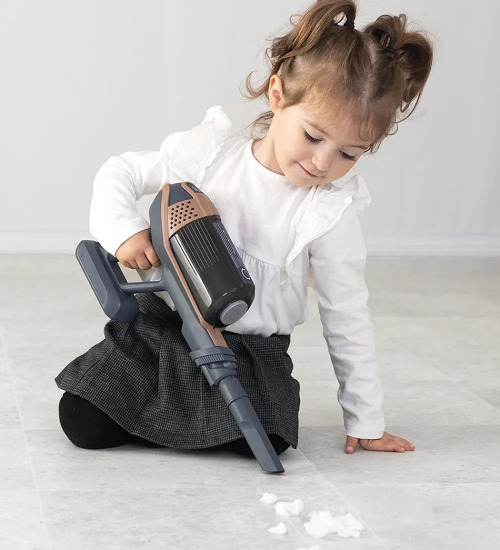 Flot Smoby støvsuger i bronze, sort og grå med et realistisk design. Støvsugeren kan bruges som almindelig støvsuger eller skilles fra hinanden, og bruges som håndstøvsuger. Der medfølger et smalt støvsugerhoved. Støvsugeren har lyd, som gør den mere realistisk.