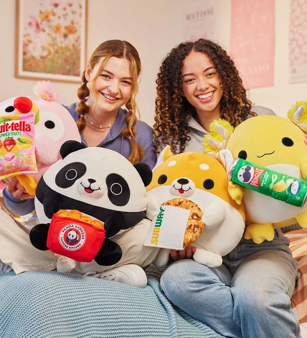Skøn Snackles bamse i form af hunden Shaun i orange og hvid med en stor cookie fra SubWay i hænderne. Bamsen er udformet som en rund pude med små ører og et sødt ansigt.