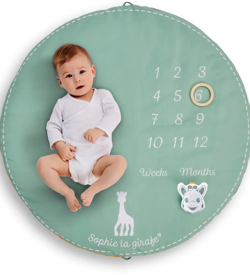 Sophie la Girafe aktivitetstæppeet har en rund form og er i en blød kvalitet, med en let vattering. Aktivitetstæppet har mange forskellige aktiviteter som alle er med til at styrke barnets udvikling, f.eks. er der et spejl, der er knitrende papir og bideringe til at lindre kløende gummer hos de små m.m. De to buer over aktivitetstæppet kan justeres i højden, så det kan vokse med barnet. På bagsiden af tæppet kan der på billeder vises hvor gammel barnet er, ved hjælp af printet af tal og den medfølgende ring.