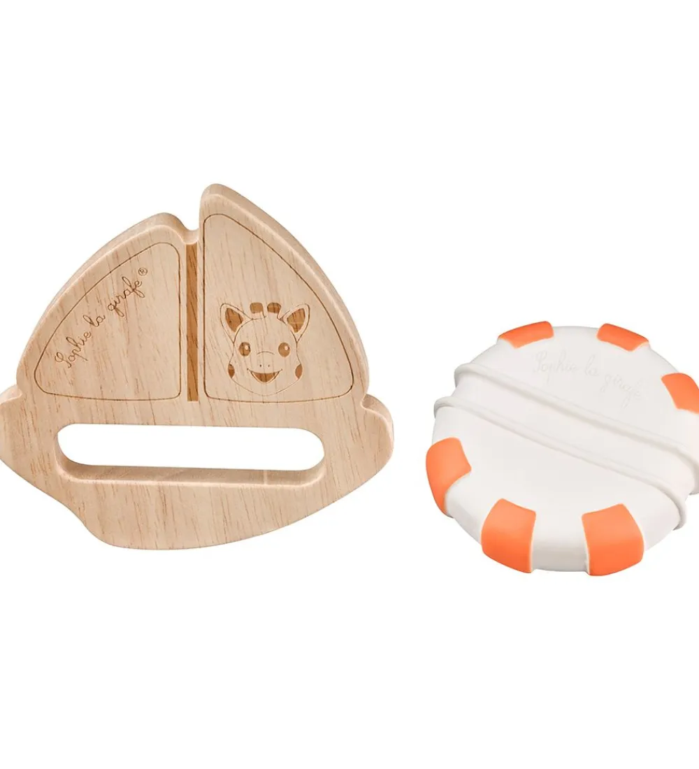 Skønt Sophie la Girafe badelegetøj i form af denne sejlbåd i heveatræ med giraffen Sophie på, som holder sig flydende på vandet ved hjælp af en hvid og orange redningskrans i naturgummi.