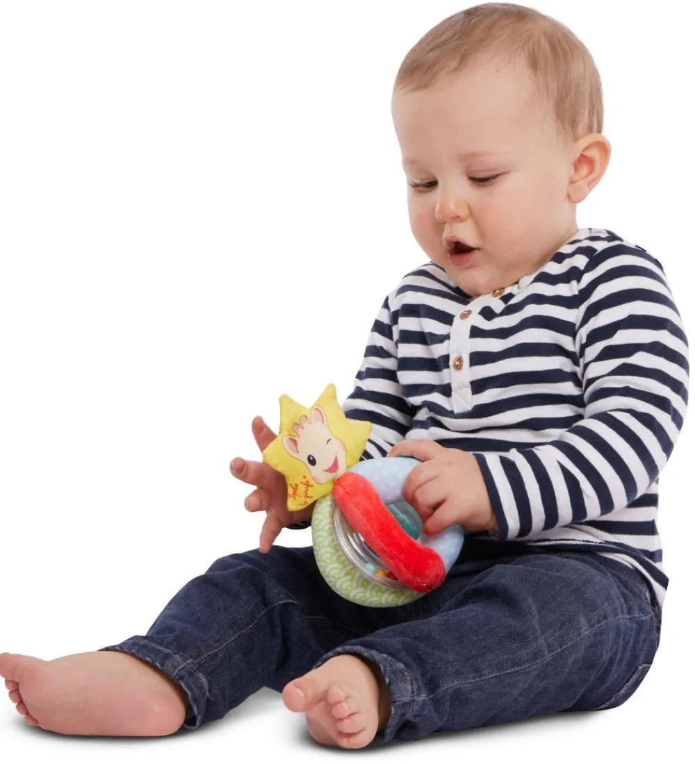 Sophie la Girafe ranglen består af fire farvede stof dele, hvor to er i blød velour. Der er yderligere to dele i gennemsigtig plast, med farverige perler som kører rundt. I den ene side er der tre mærker, så der er massere at lege med.