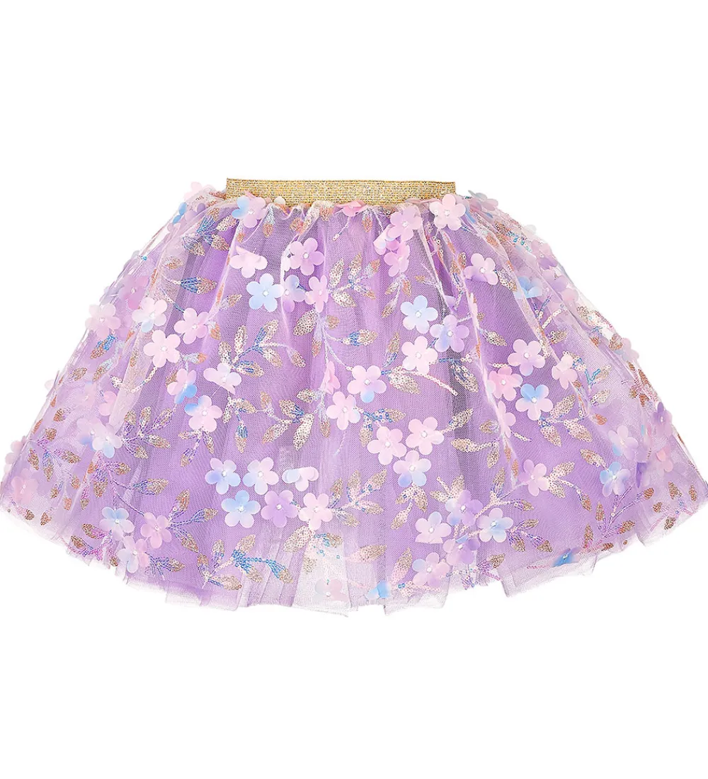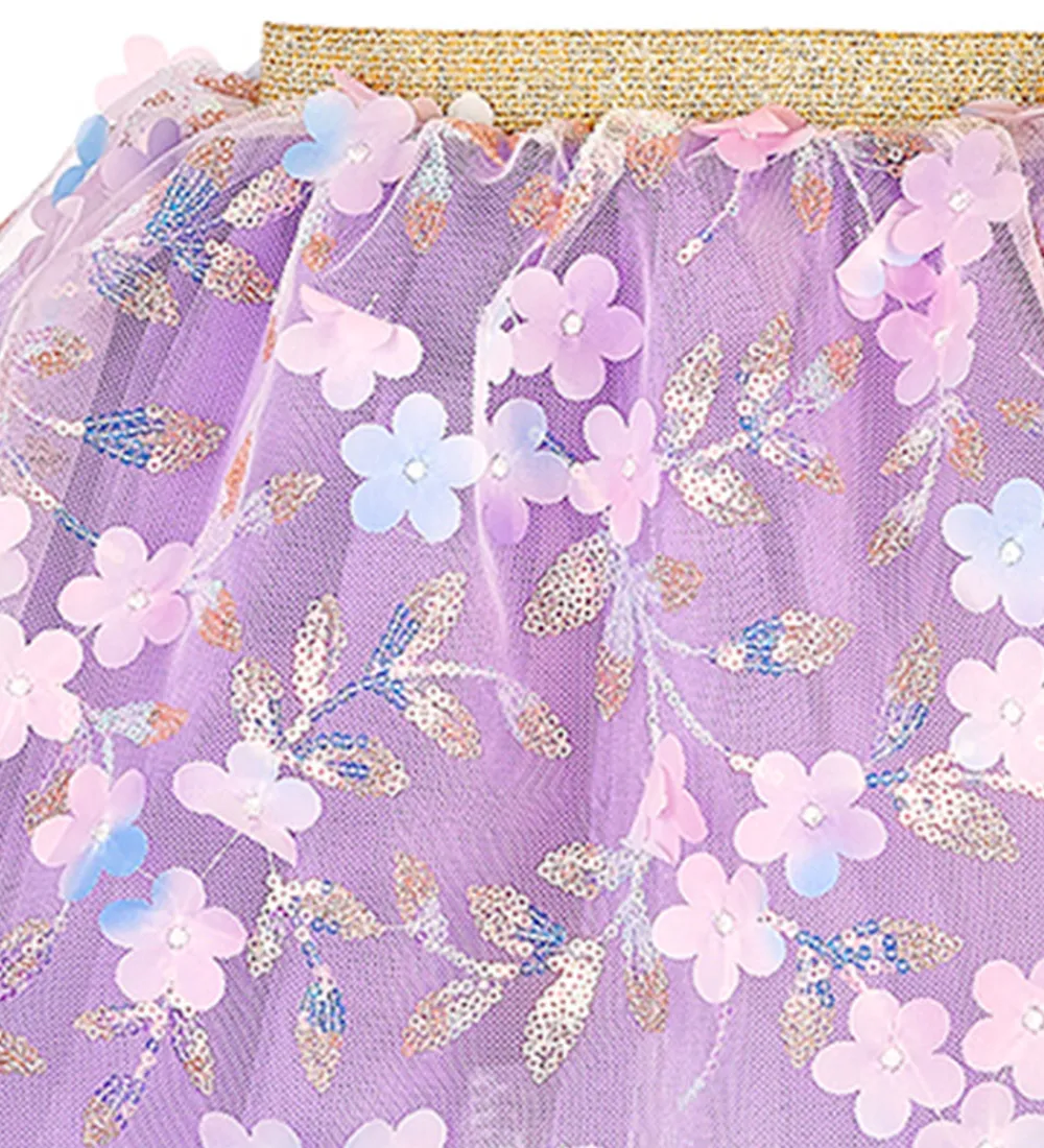 Yndig Souza udklædning i form af et tylnederdel i lilla med blomsterapplikationer af palietter.