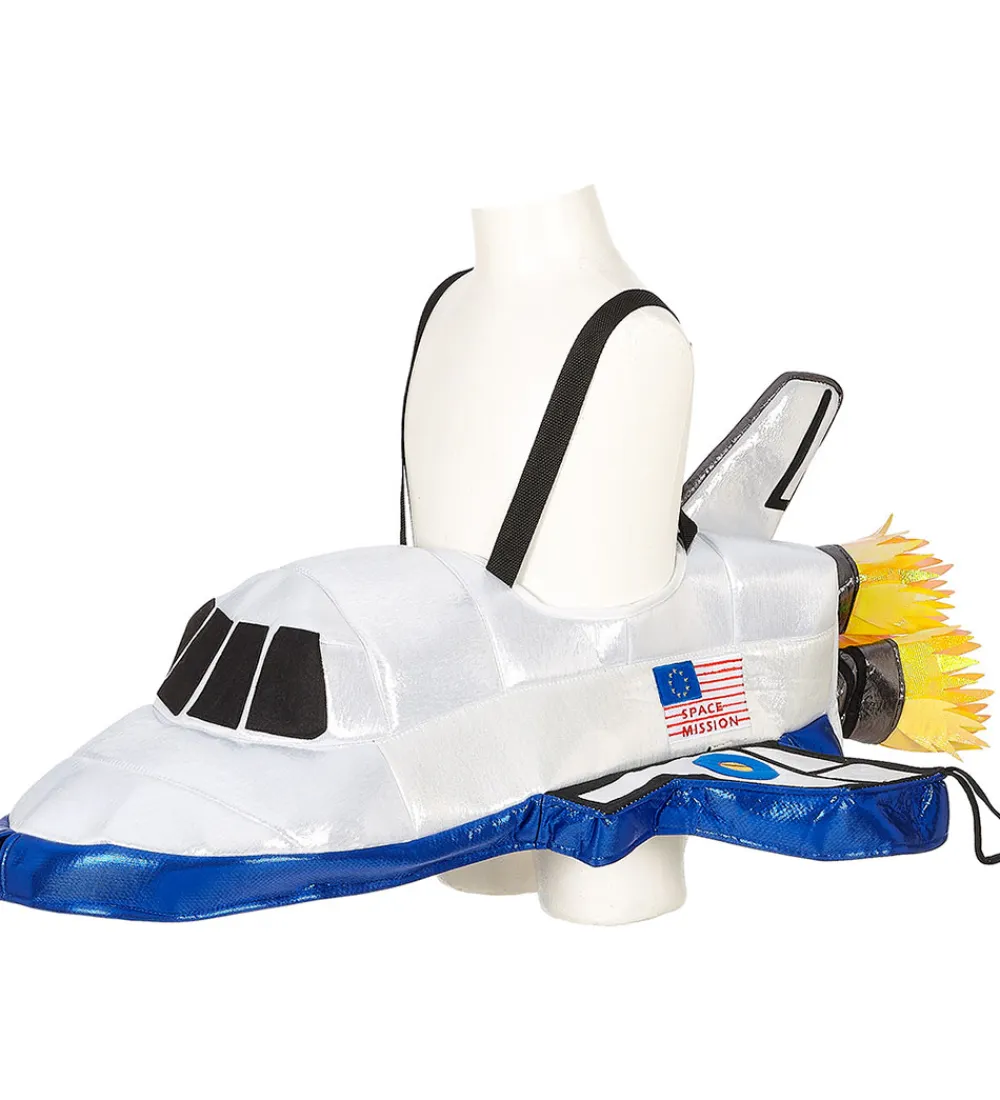 Fin Souza udklædning i form af en rumraket i hvid og med blå detaljer.