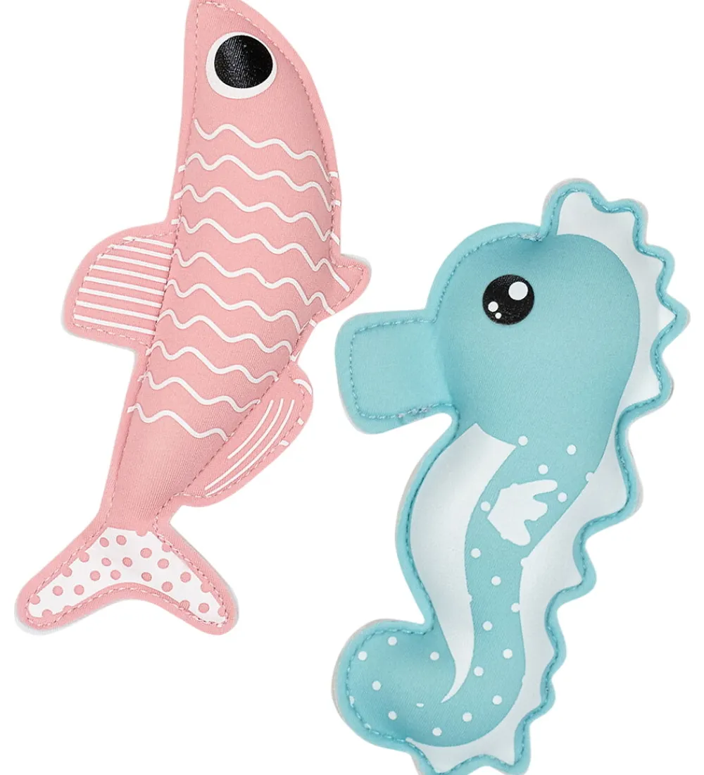 Charmerende Splash About badelegetøj bestående af en fisk i rosa med bølgemønster, og en søhest i lyseblå med prikker. Badelegetøjet har et blødt design, kan synke til bunden af poolen og er fremstillet af neoprenrester.