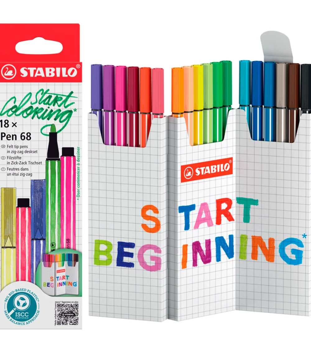 Flotte Stabilo tuscher solgt i en 18-pak, der inkluderer forskellige standard farver.