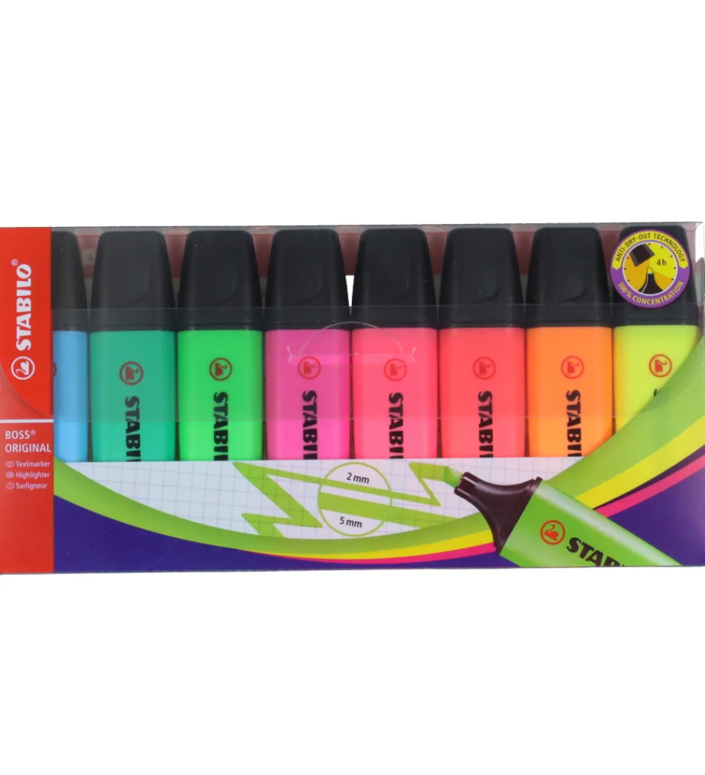 Stabilo overstregningstuscherne bruges til at markere i tekst og farvelægge større områder. Tuscherne har en smart spids, som kan tegne i 2 bredder; 2 og 5 mm. Overstregningstuscherne kan klare 4 timer uden låg på, uden de tørrer ud, og de kan desuden blev genopfyldt.