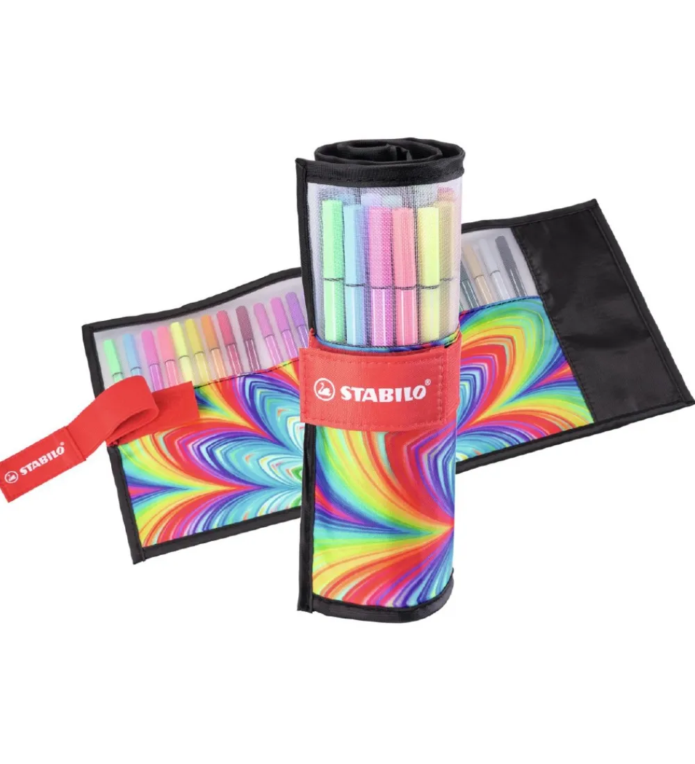 Stabilo tusherne er en filtpen med en medium størrelse spids af høj kvalitet. Med tuschene medfølger en praktisk indpakning med en velkrolukning, der nemt holder tuscherne organiseret.
