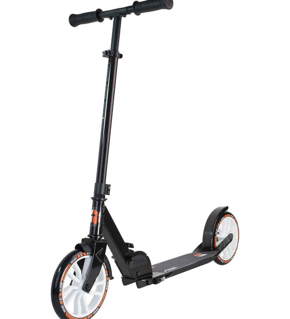 Smart Stiga løbehjul i en sort aluminium/stål-ramme med orange detaljer, der kan foldes sammen.