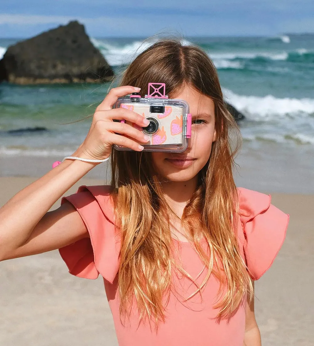 Sjovt SunnyLife undervandskamera i hvid, med print af jordbær i rosa og orange.