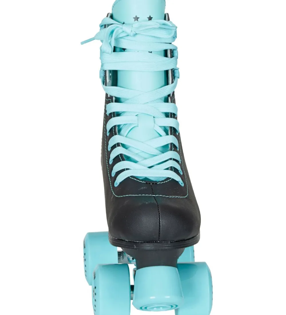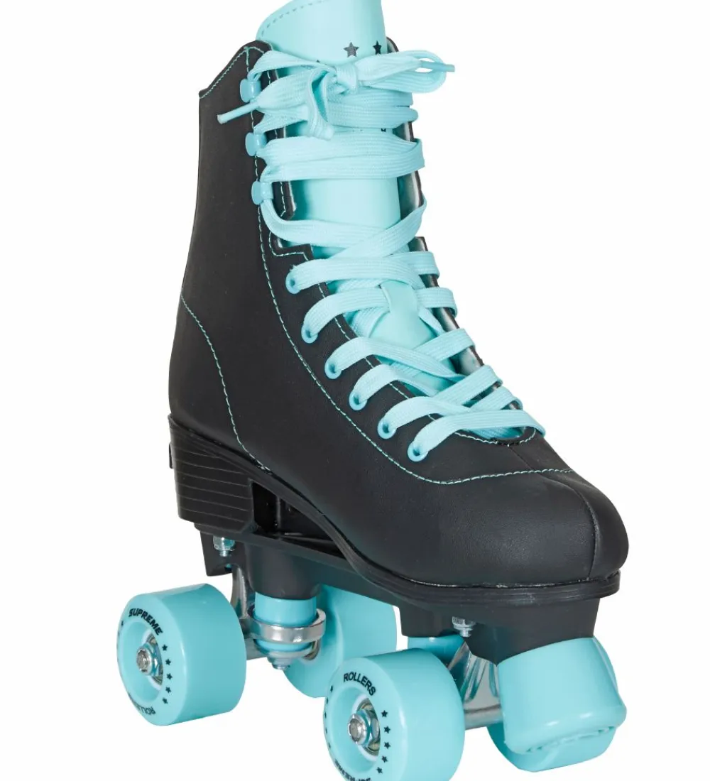 Seje Supreme rulleskøjter i sort med turkisblå snørebånd og hjul.