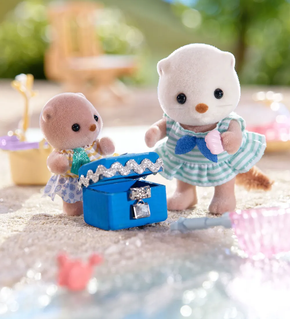 Sødt Sylvanian Families figursæt, der indeholder 2 figurer (Sea Otter Sisters), en legegummibåd og tilbehør i form af bl.a. er snorkelsæt.