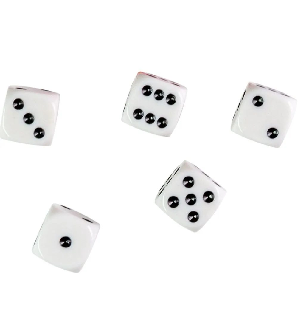Klassiske TACTIC terninger i hvid med sorte prikker. Der er 5 terninger i pakken.