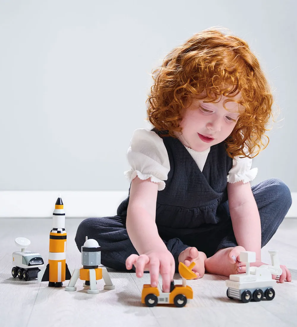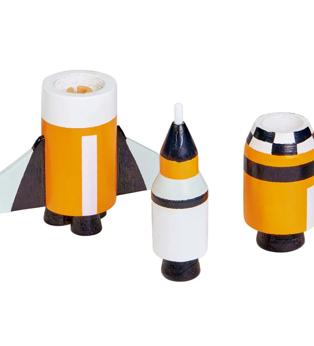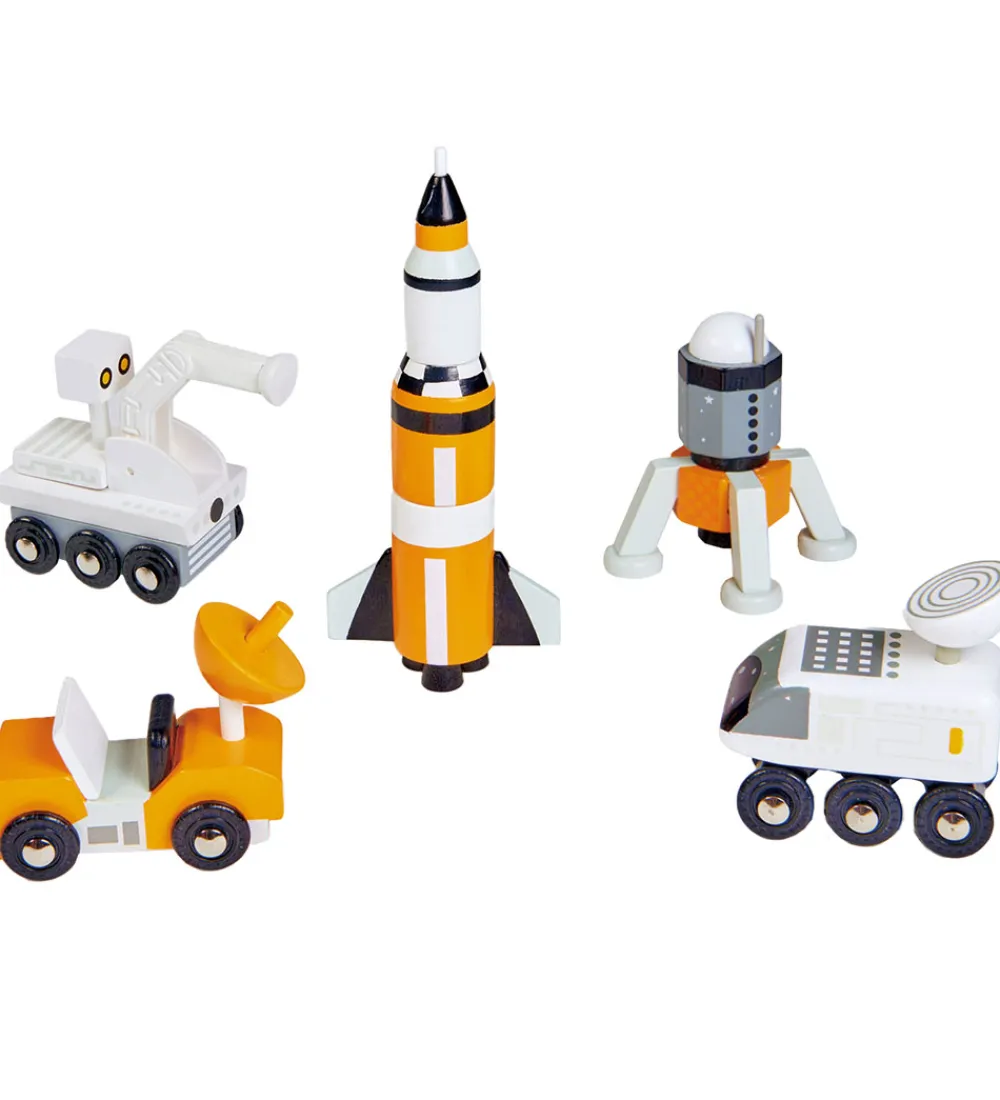 Sjovt Tender Leaf trælegetøj formet som fem forskellige rumkøretøjer i hvid, sort og orange.