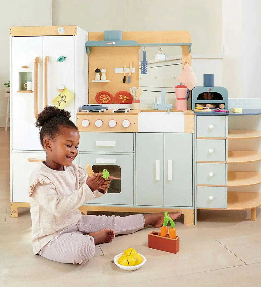 Tender Leaf legekøkkenet et fuldt udstyret med ovn, håndvask, kogeplader, emhætte samt opbevaringsplads over ovn, under håndvasken, skuffer samt hylder i den ene side. Knapperne over ovnen kan drejes og siger sjove kliklyde. Over kogepladen er der en hylde samt en knivblok, hvor de magnetiske knive kan hænge. Over vinduet er der en hylde samt kroge.