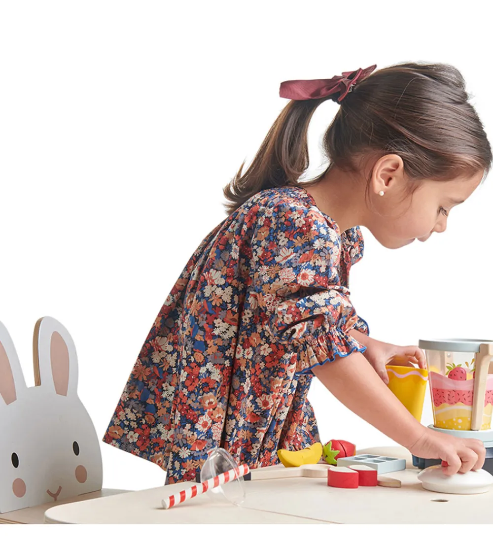 Herligt Tender Leaf legetøjssæt i lyse farver med en blender. Sættet indeholder smilende smoothie, skiver af frugt og tern. Perfekt til små, kreative legescenarier. Tender Leaf fokuserer på kvalitet og sjov i legen.