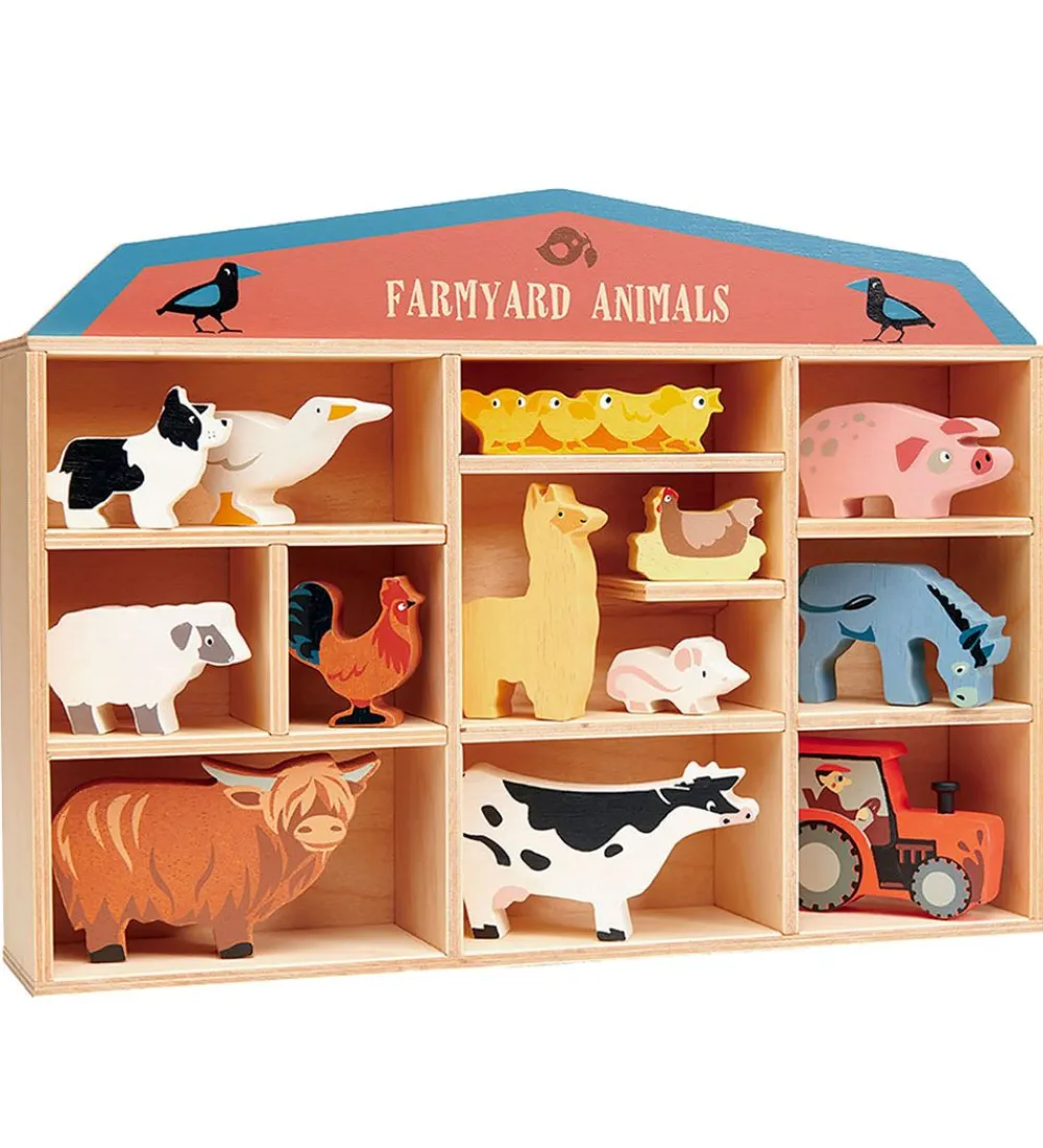 Sødt Tender Leaf trælegetøj i naturlig træ og fine farver, som er formet som 13 flotte bondegårsdyr.
