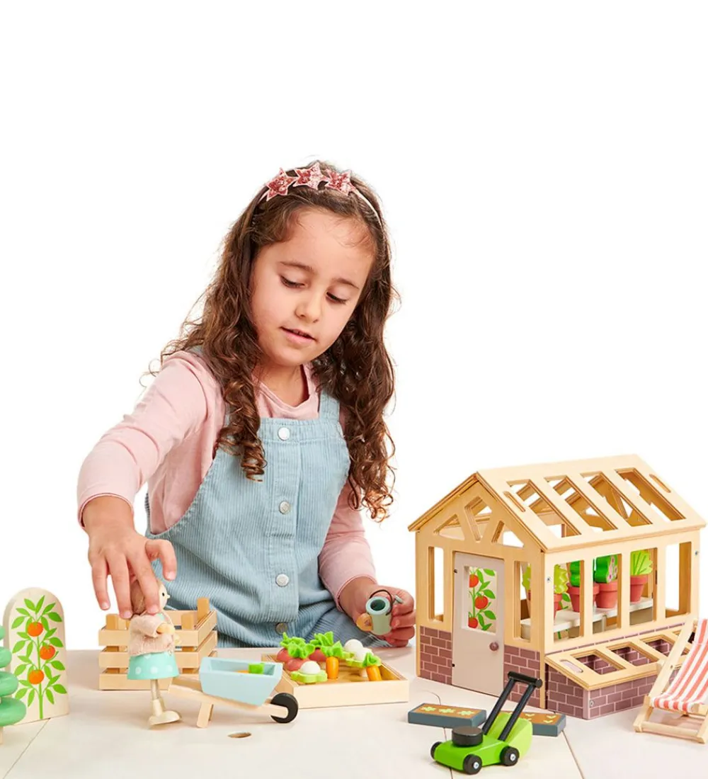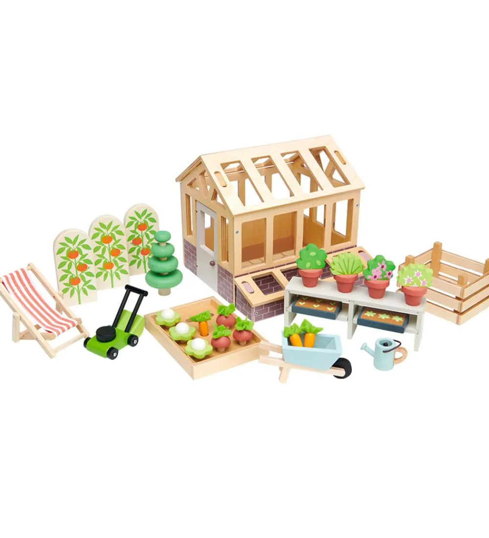 Fint Tender Leaf trælegetøj i naturlig træ og fine farver, som er formet som et drivhus med følgende ting: