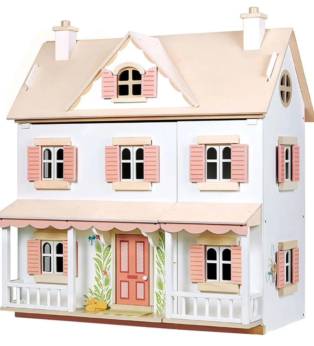 Fint Tender Leaf dukkehus i naturlig træ i hvid og rosa nuancer.