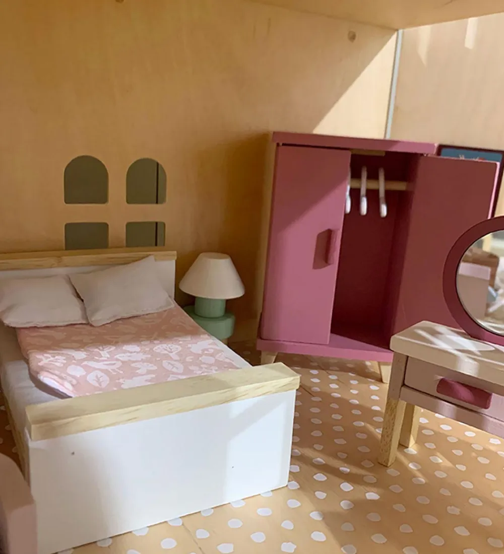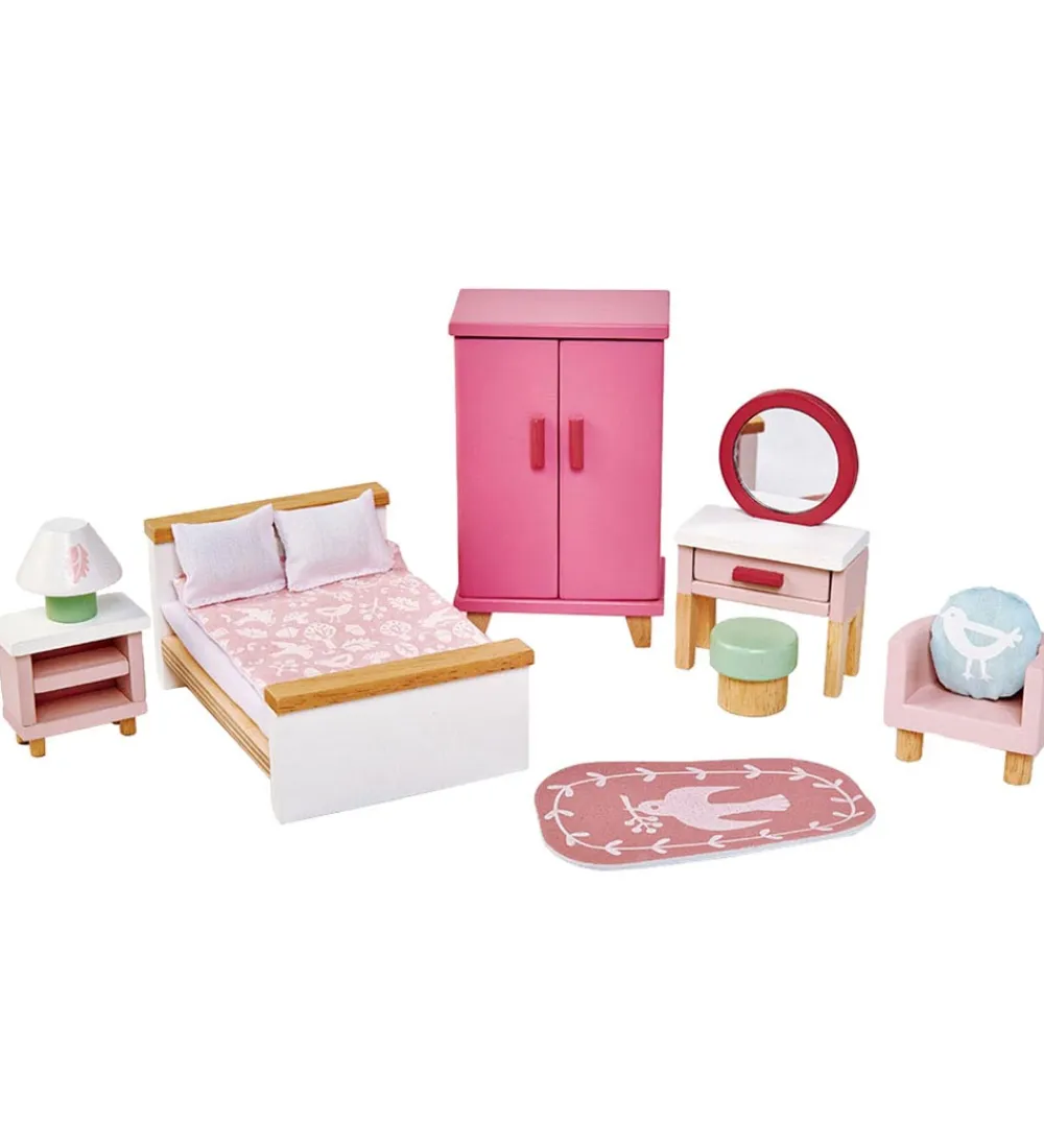 Fint Tender Leaf trælegetøj i naturlig træ og fine farver, som er formet som forskellige møbler til soveværelset med følgende ting: