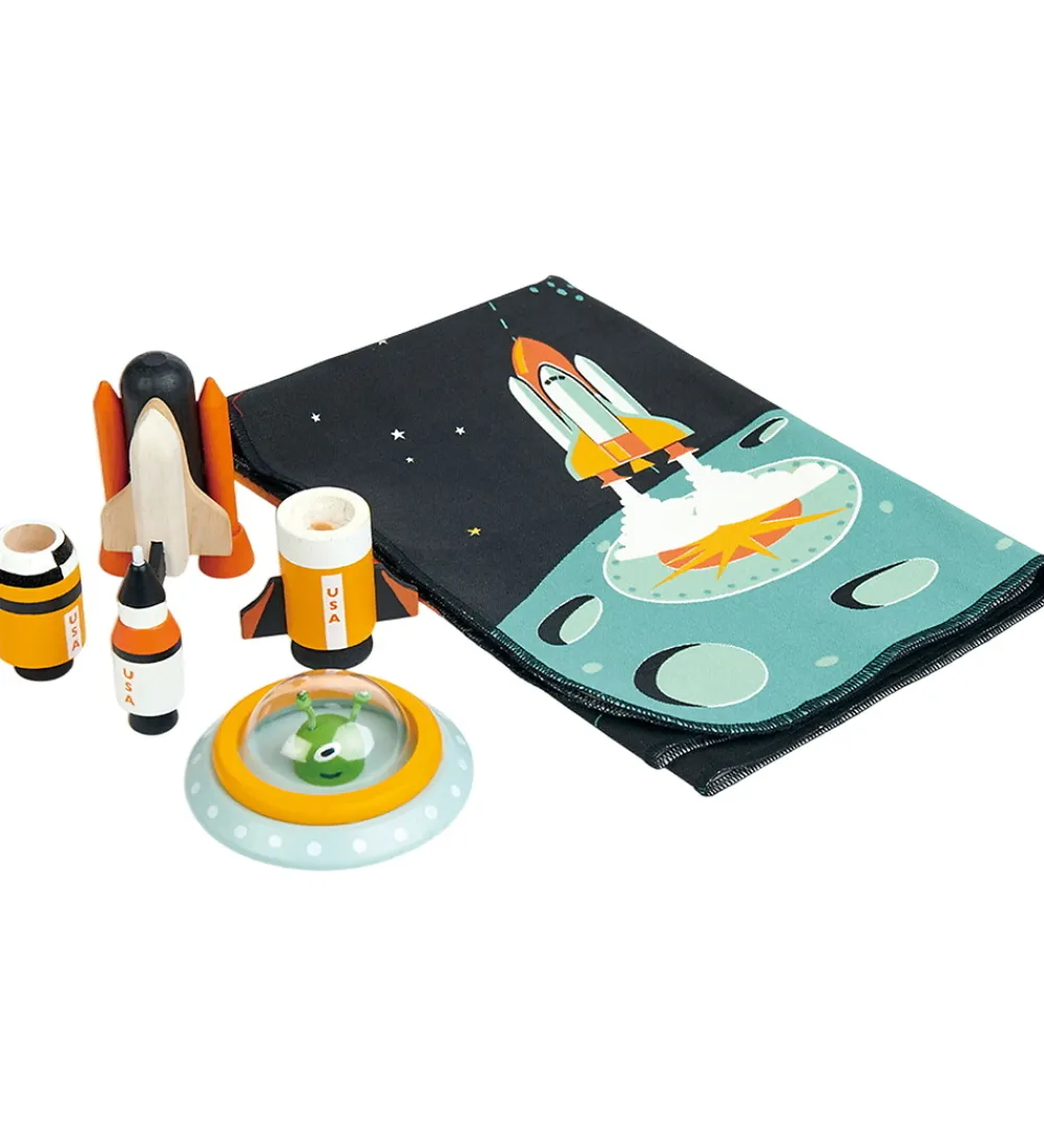 Fantastisk Tender Leaf legetøjssæt bestående af en mørk stofmåtte med et detaljeret rumprint. Tender Leaf legetøjet har raketter og ufoer, der skaber en spændende, rumrejse-inspireret oplevelse for de små opdagelsesrejsende.