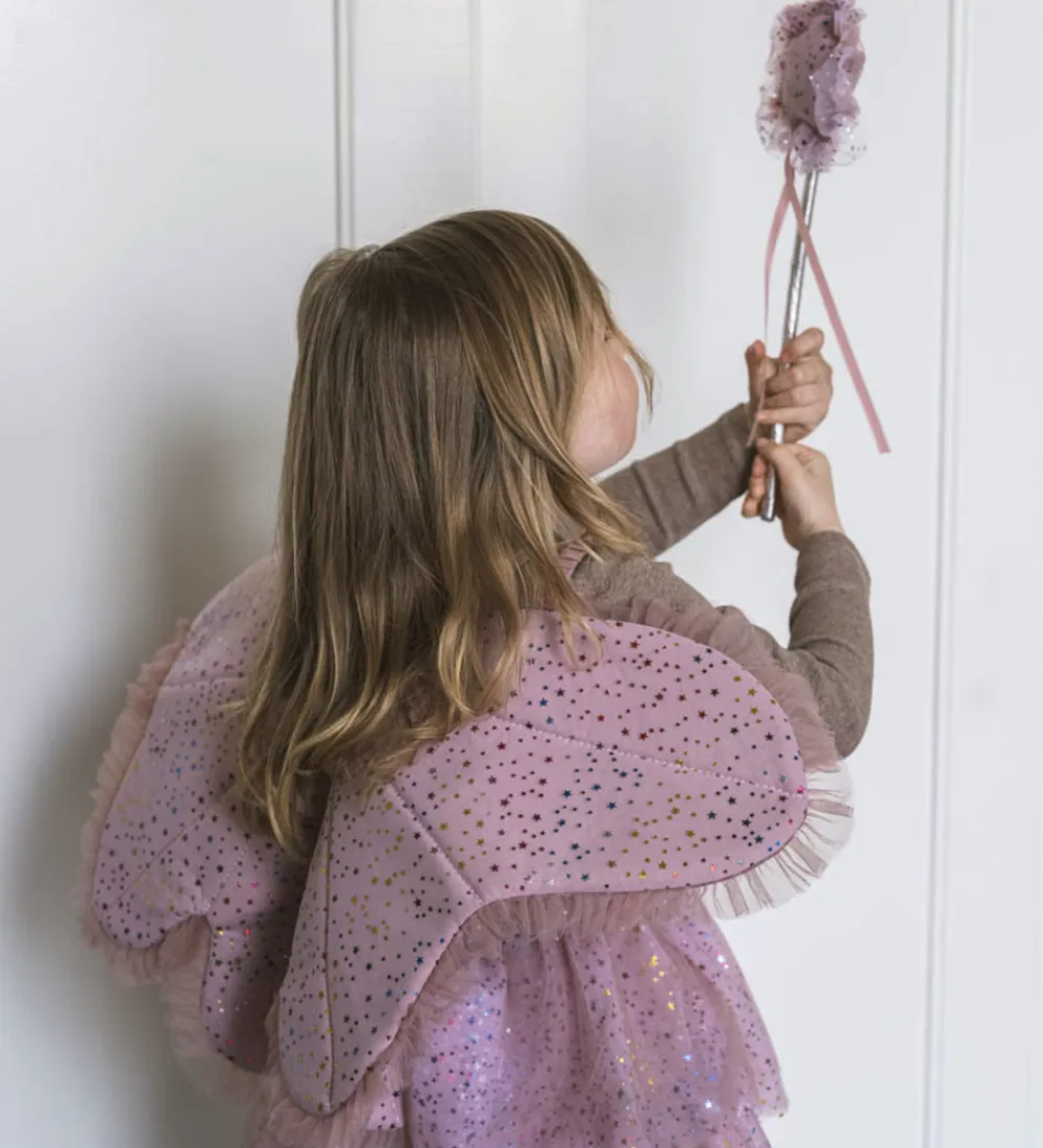 That’s Mine udklædningen rummer fevinger og en tryllestav med klokke og har elastiske stropper, så den er nem at få på.