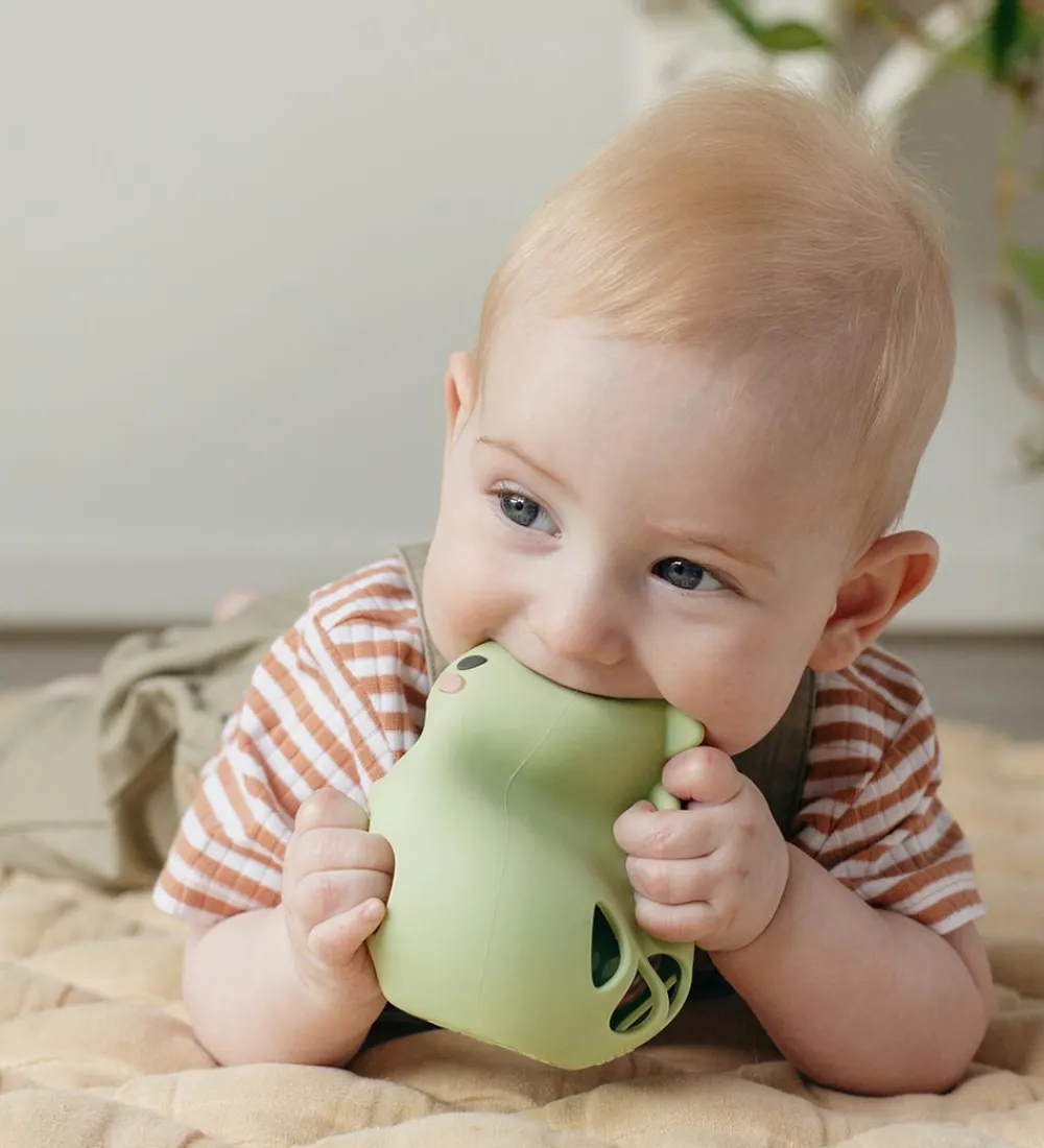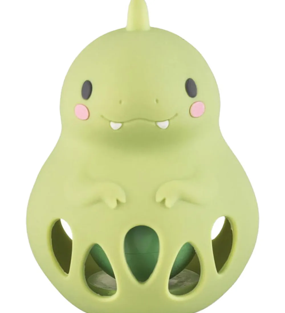 Sjov Tiger Tribe range formet som en dinosaur i lysegrøn silikone med en rangle indeni. Ranglen er blød at røre ved og let for små hænder at gribe fast i. Ranglen har et sødt design og en spændende ranglelyd.
