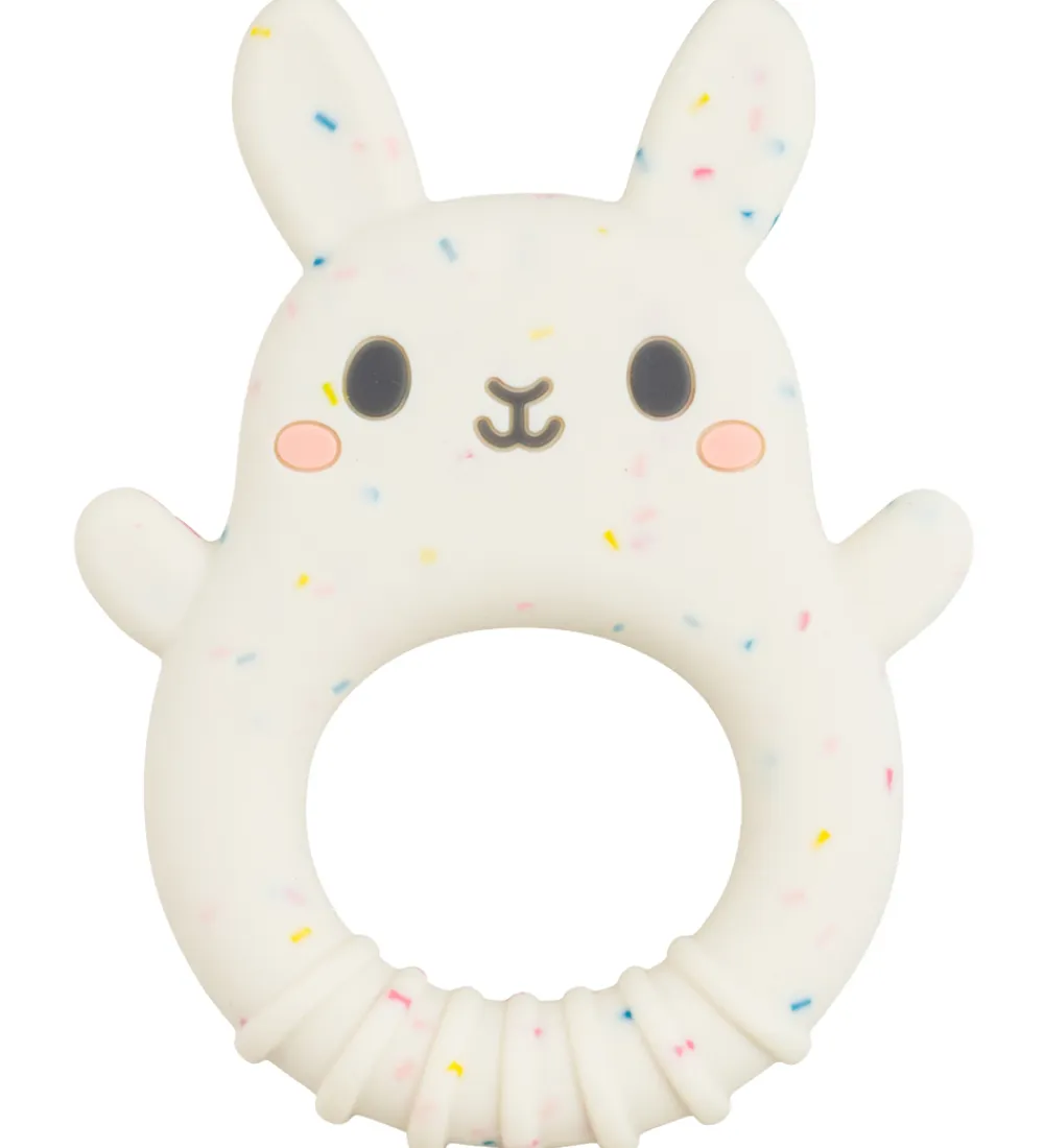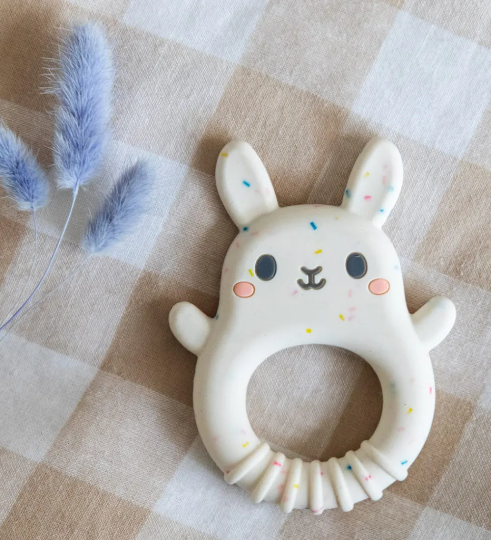 Skøn Tiger Tribe bidering i råhvid med nister i forskellige farver, og formet som en kanin. Bideringen stimulerer og beroliger tandkødet, samtidig med at den er sjov for de små at lege med.