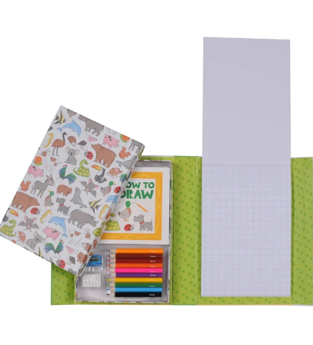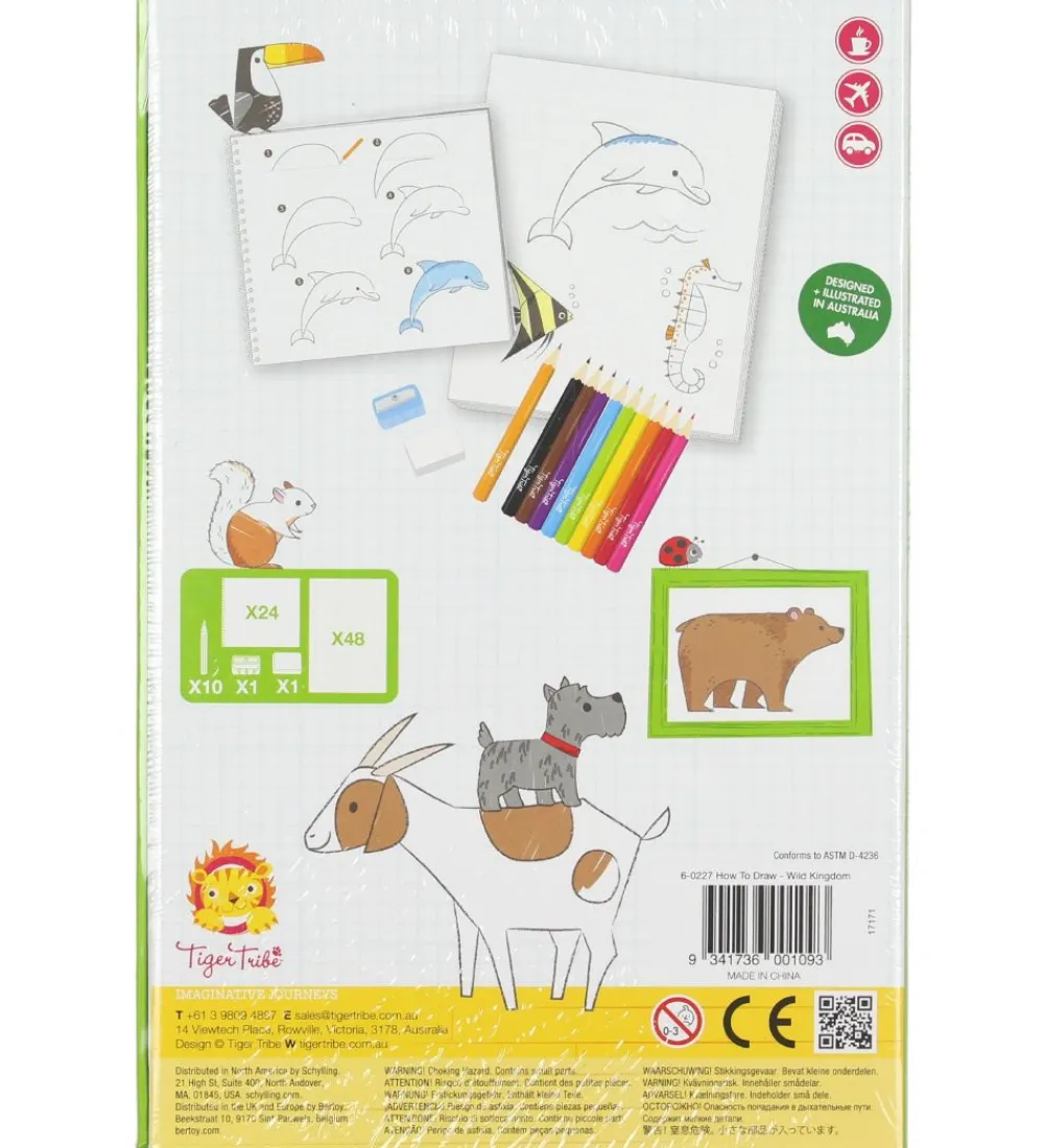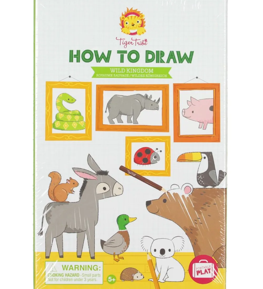 Tiger Tribe tegnesættet lærer dig at tegne flotte tegninger. Det består af en praktisk opbevaringsæske med en blyant samt 10 farveblyanter, et viskelæder og en blyantspidser, en bog med trin for trin-vejledninger til 24 forskellige dyr samt en papirblok med 48 sider.