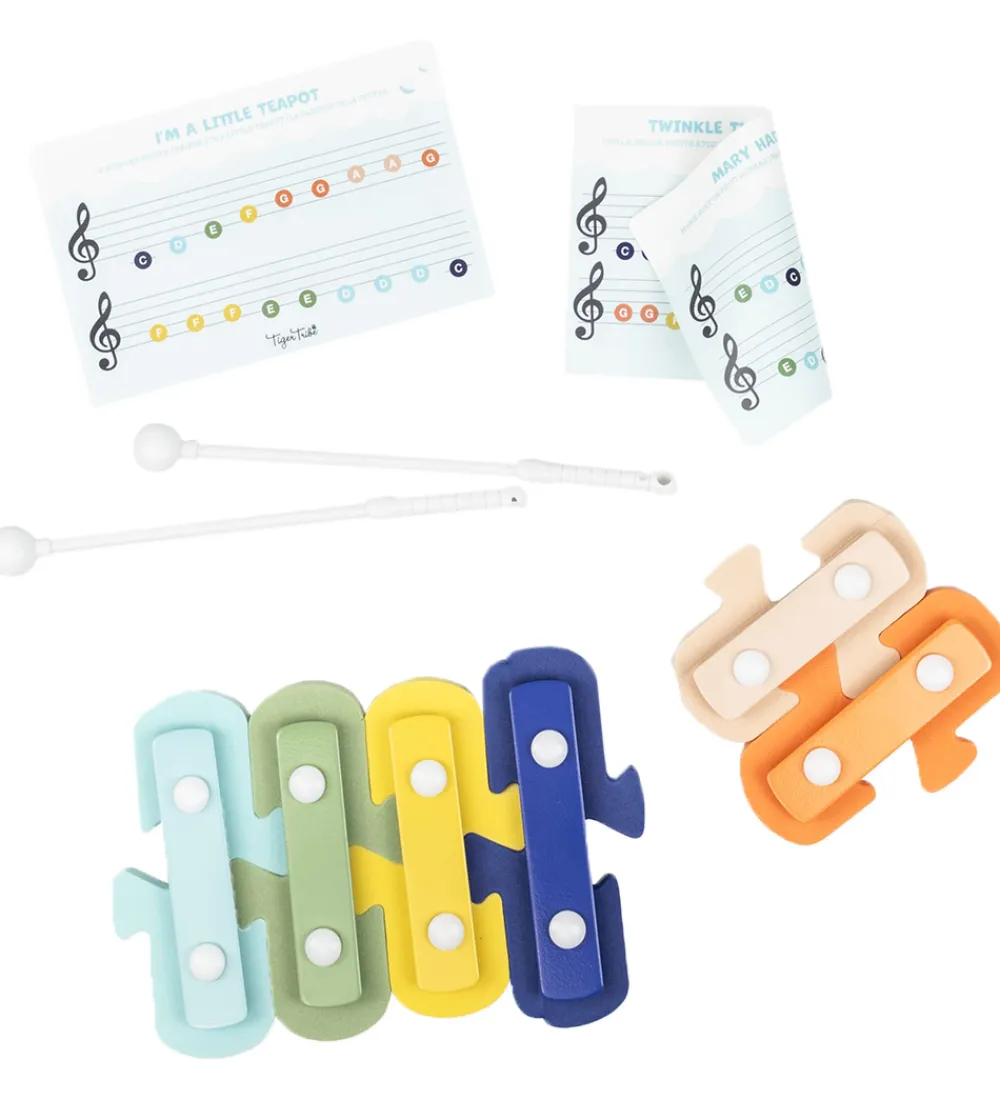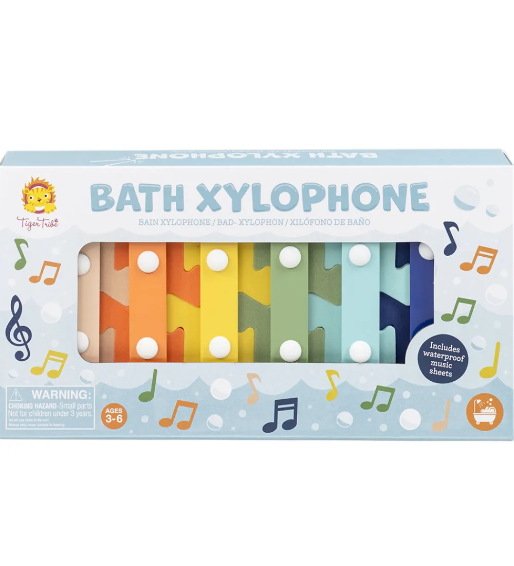 Tiger Tribe bade-xylofonen er lavet af skum-puslespilsbrikker, som gør det muligt at have den med, når barnet er i bad. Selve tangenterne er i metal, så instrumentet lyder, som det skal. Med til følger to dobbeltsidede, vandtætte nodeark til små stille melodier, som kan spilles på bade-xylofonen.